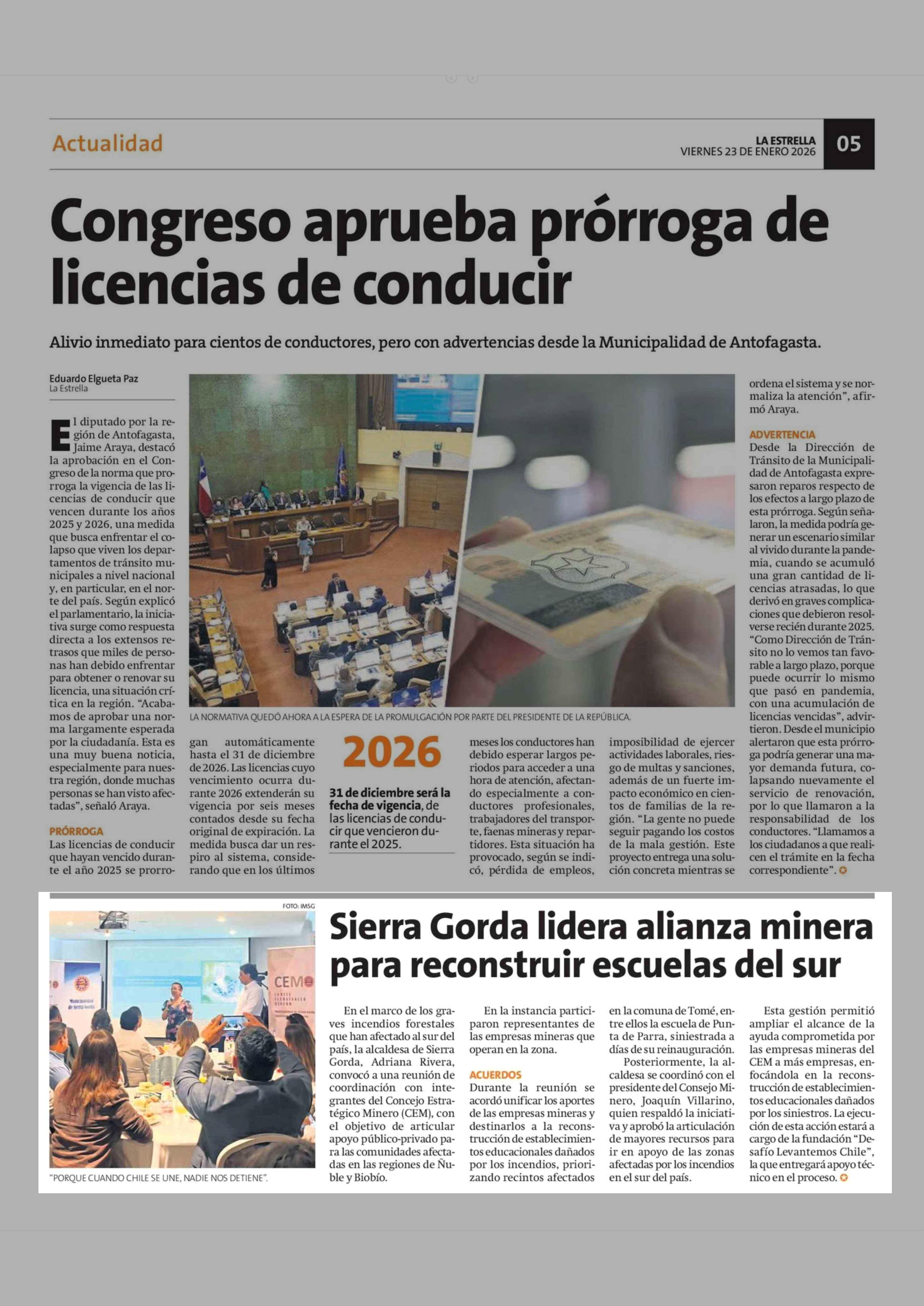 Sierra Gorda lidera alianza minera para reconstruir escuelas del sur 23-01-2026 La Estrella de Antofagasta |