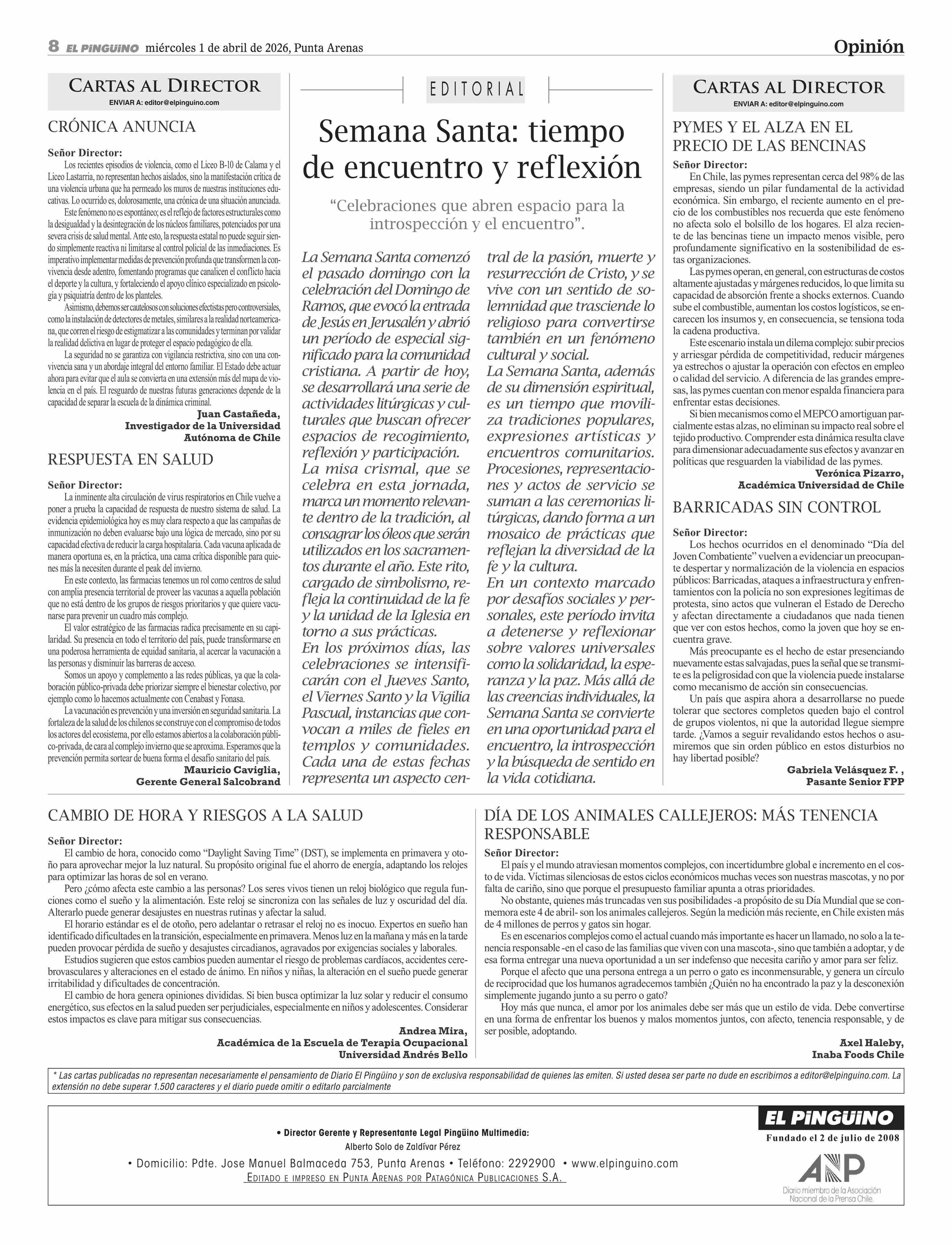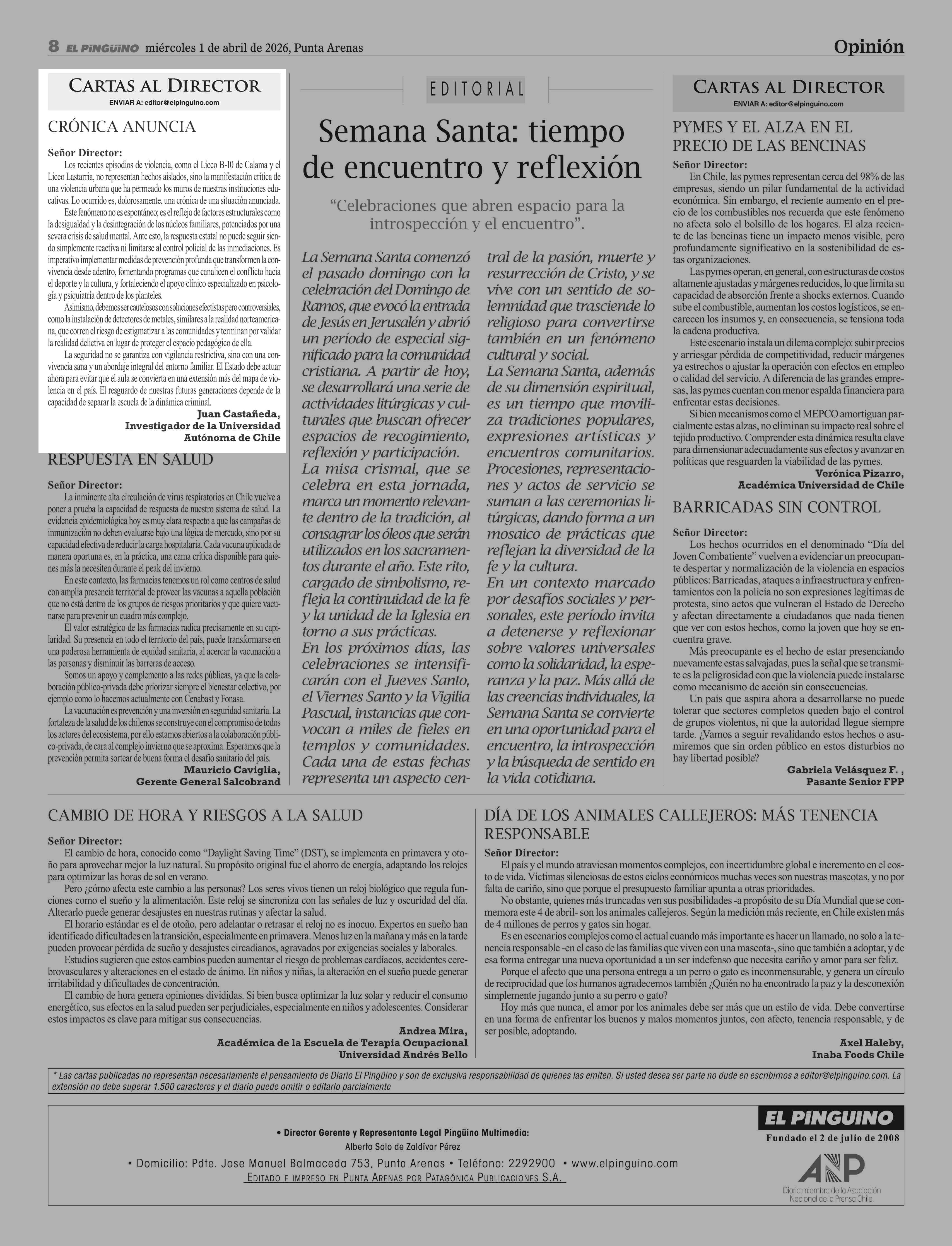 Cartas: Crónica anuncia 01-04-2026 El Pingüino |