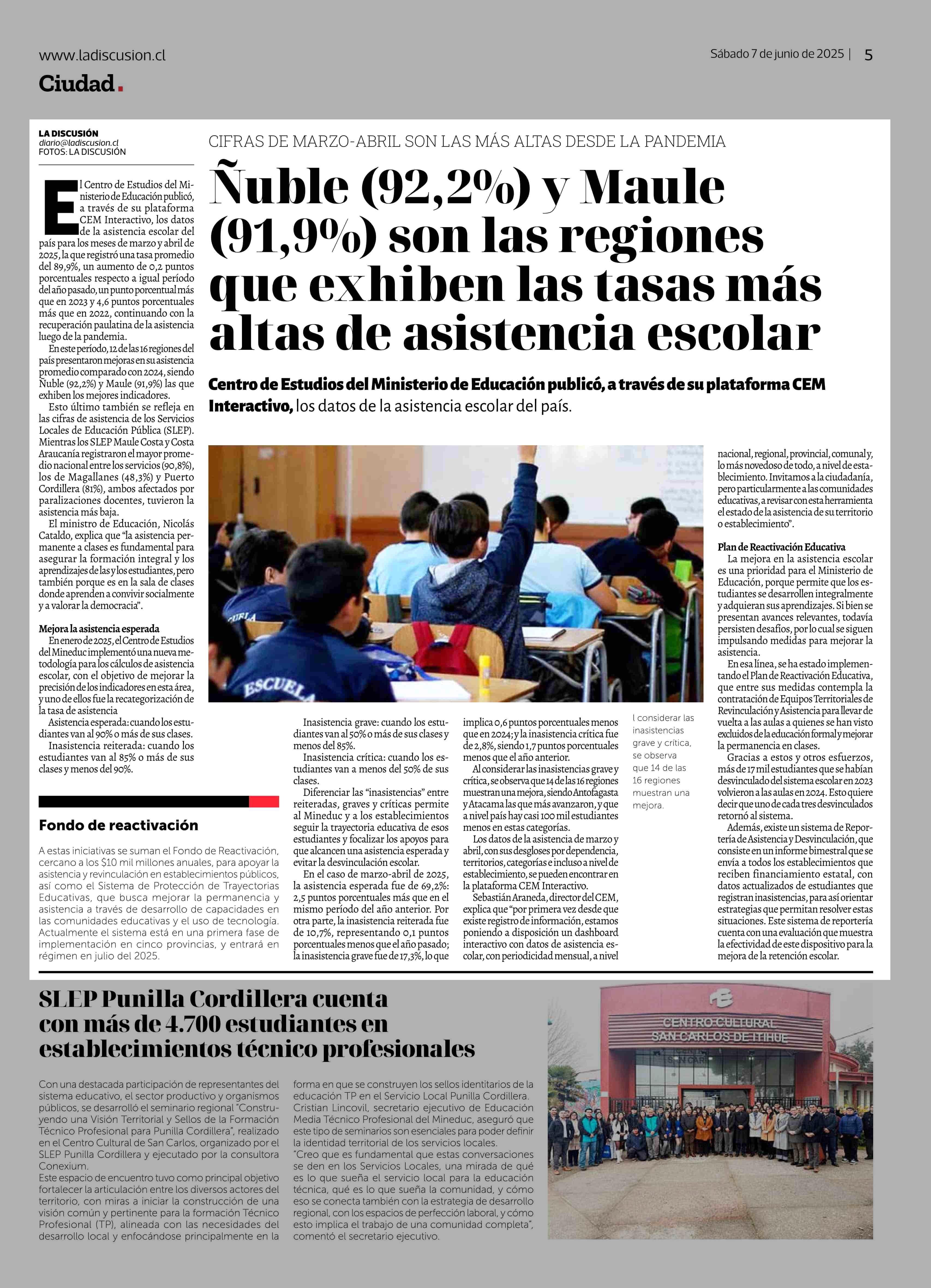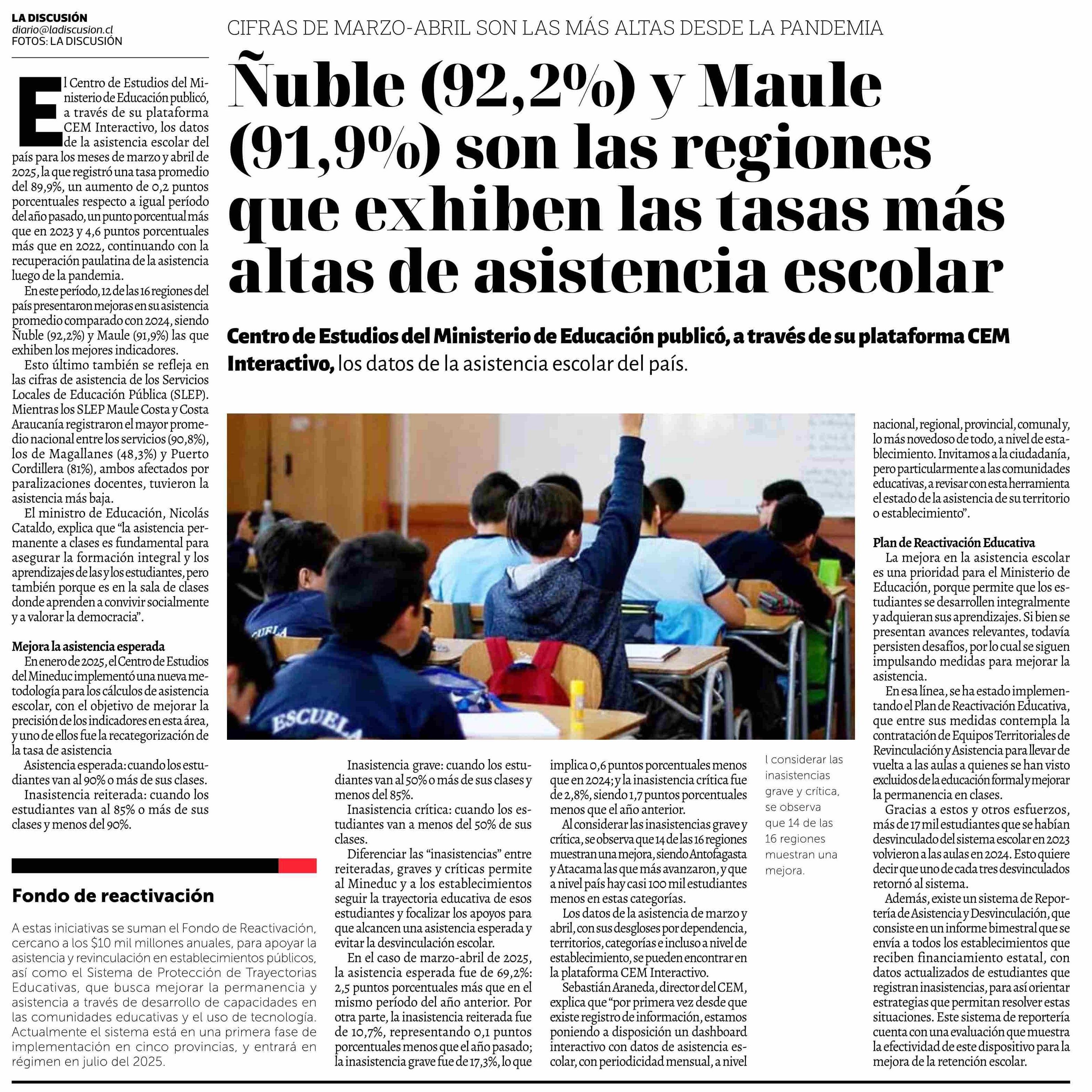 Ñuble (92,2%) y Maule (91,9%) son las regiones que exhiben las tasas más altas de asistencia escolar 07-06-2025 La Discusión |