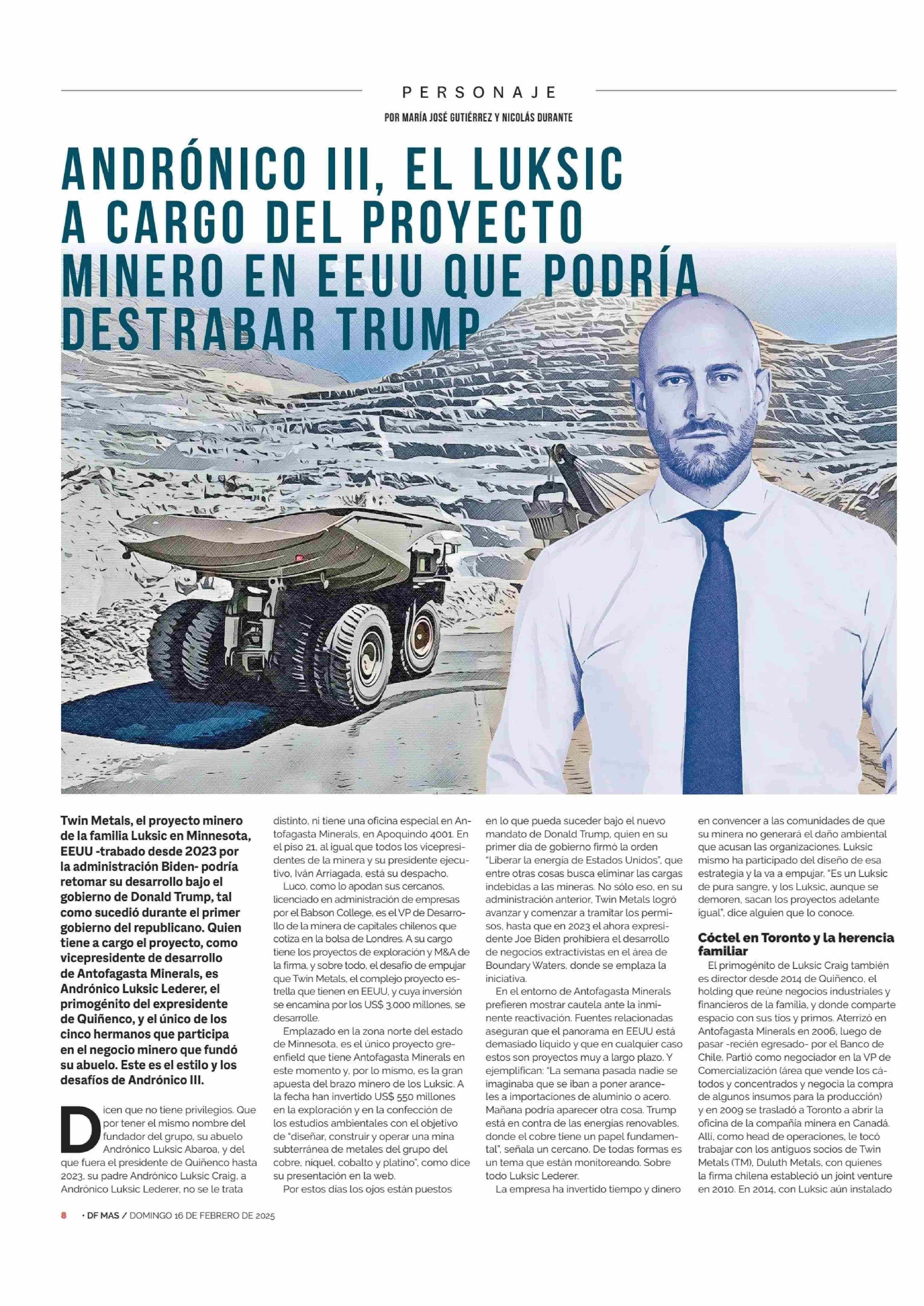 ANDRÓNICO III, EL LUKSIC A CARGO DEL PROYECTO MINERO EN EEUU QUE PODRÍA DESTRABAR TRUMP 16-02-2025 Diario Financiero |