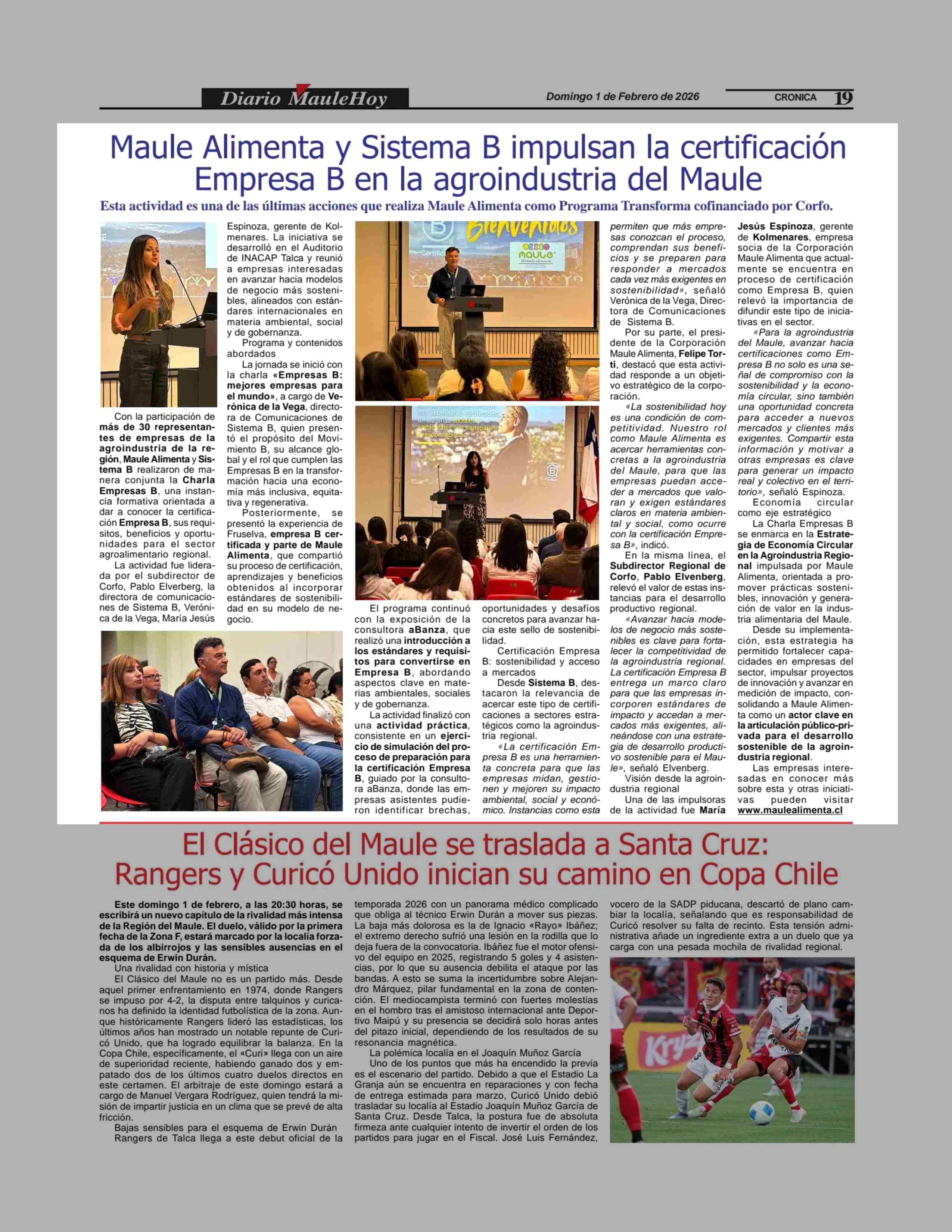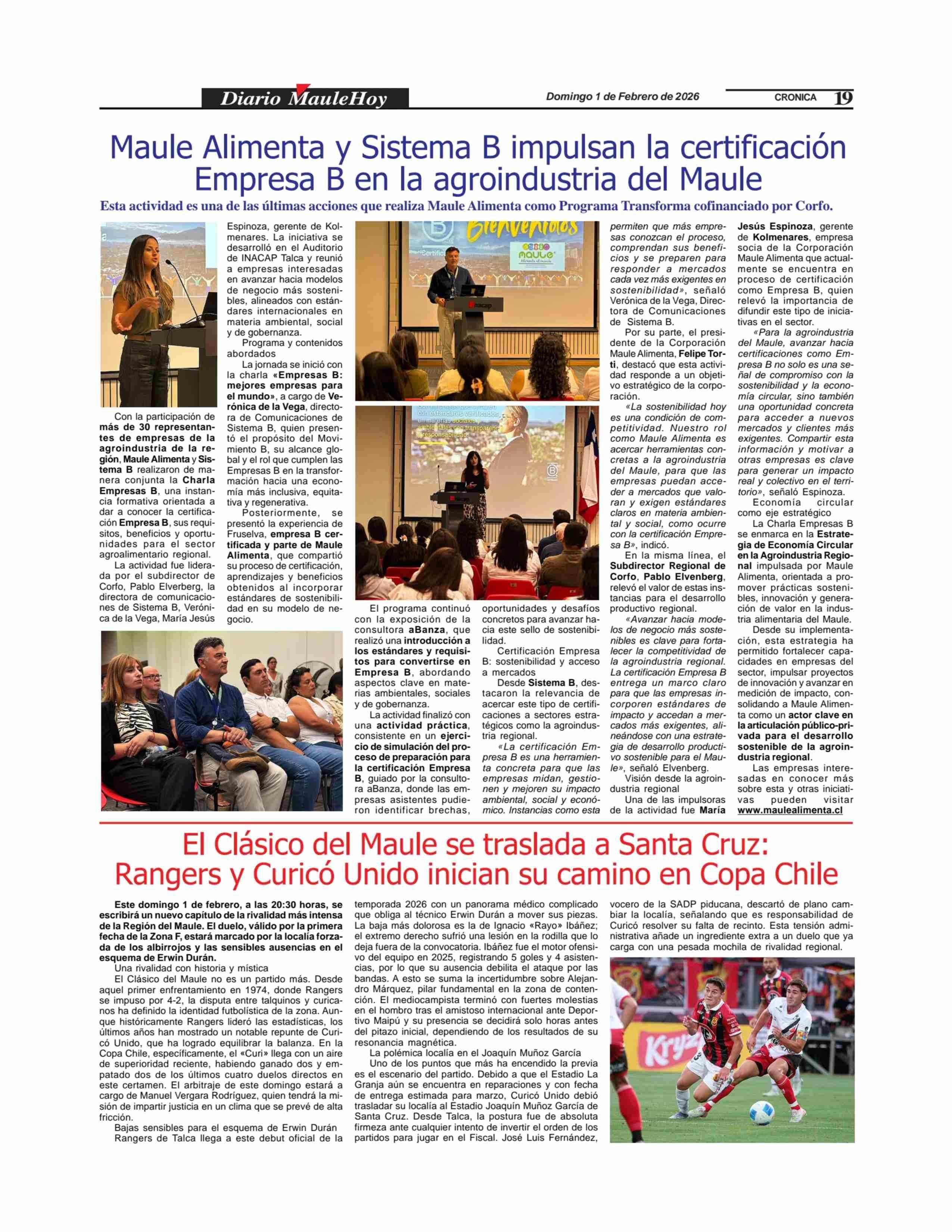 Maule Alimenta y Sistema B impulsan la certificación Empresa B en la agroindustria del Maule 01-02-2026 Maule Hoy |
