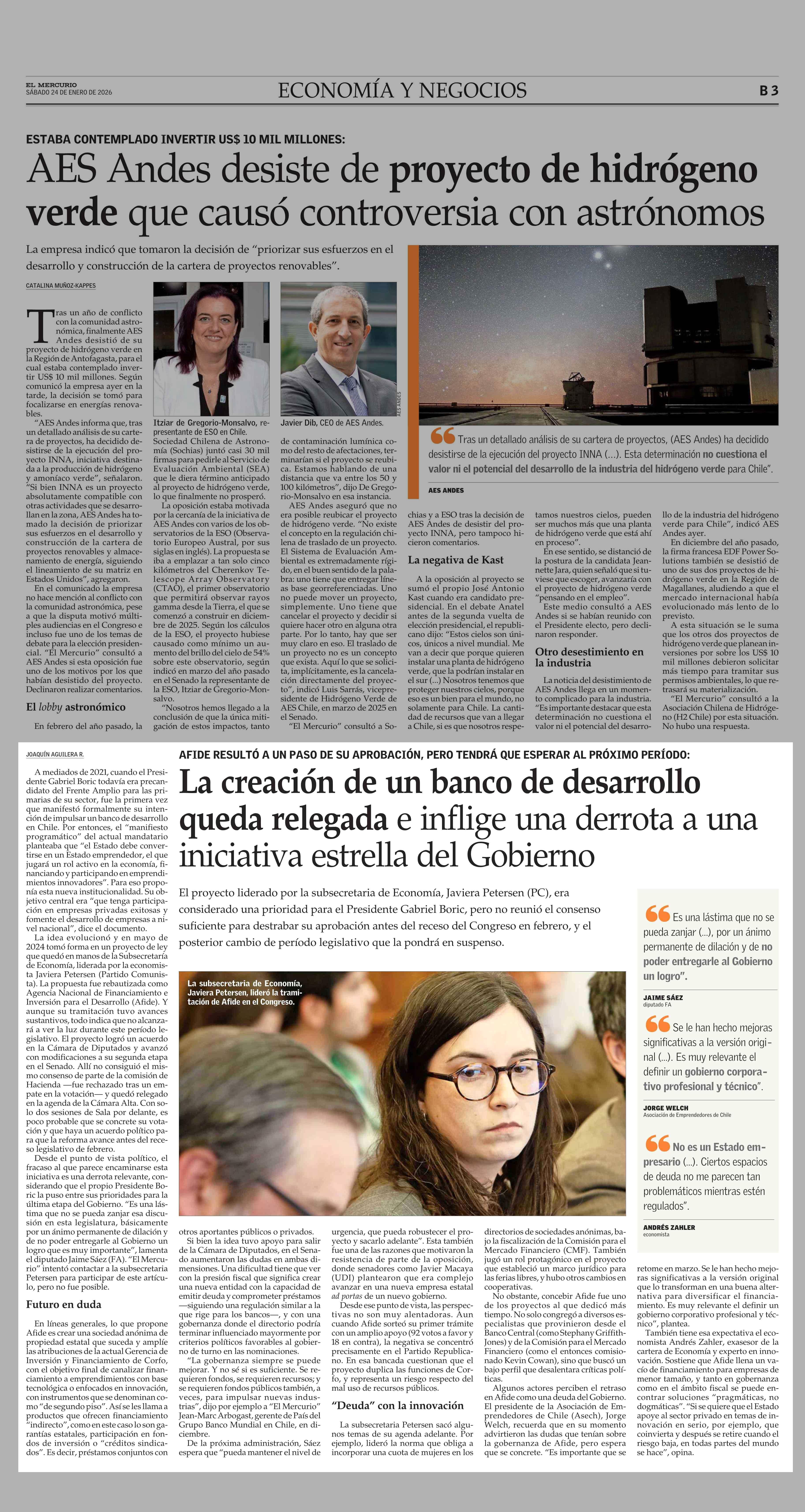 La creación de un banco de desarrollo queda relegada e inflige una derrota a una iniciativa estrella del Gobierno 24-01-2026 El Mercurio |