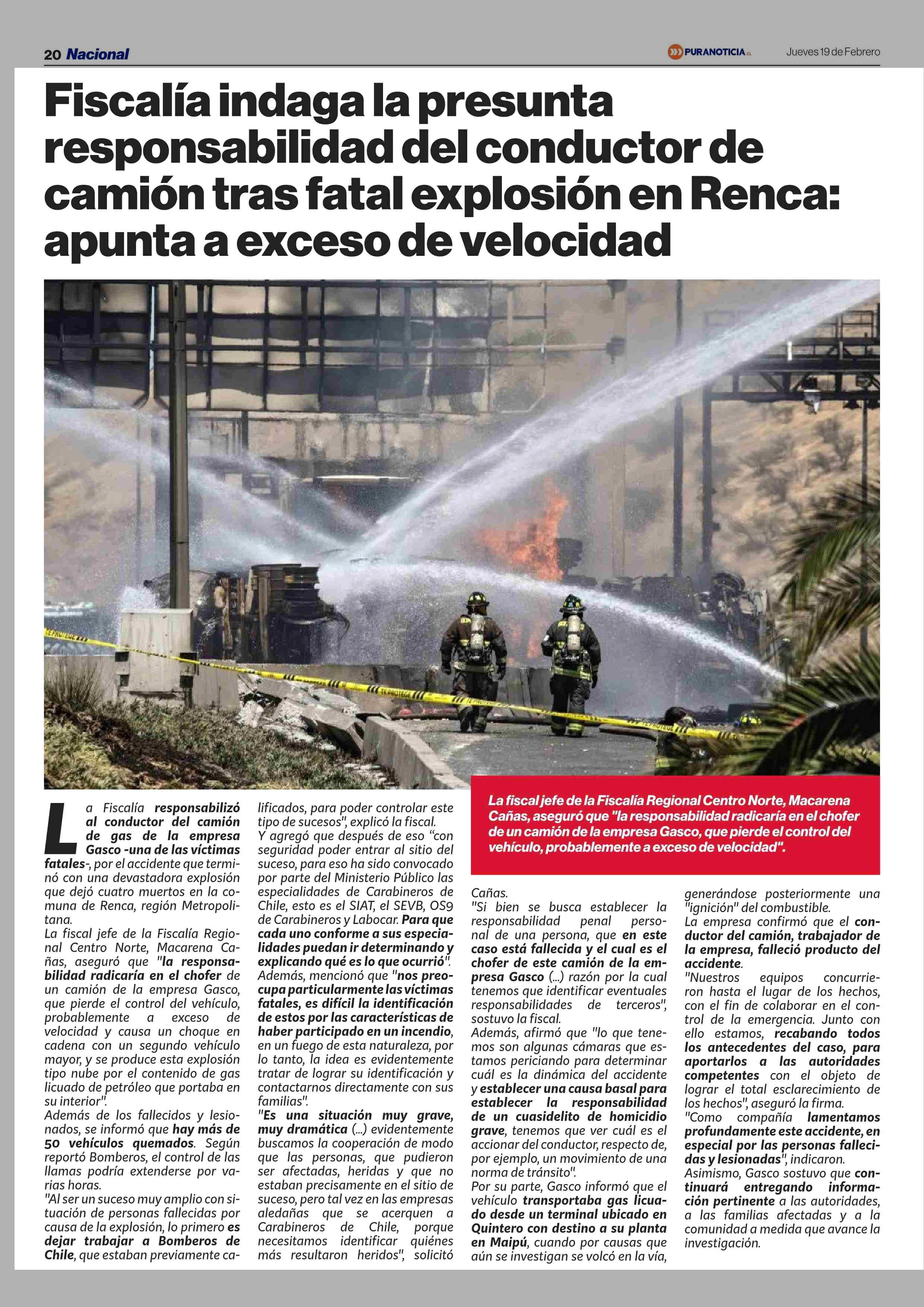 Título: Fiscalía indaga la presunta responsabilidad del conductor de camión tras fatal explosión en Renca: apunta aexceso de velocidad
