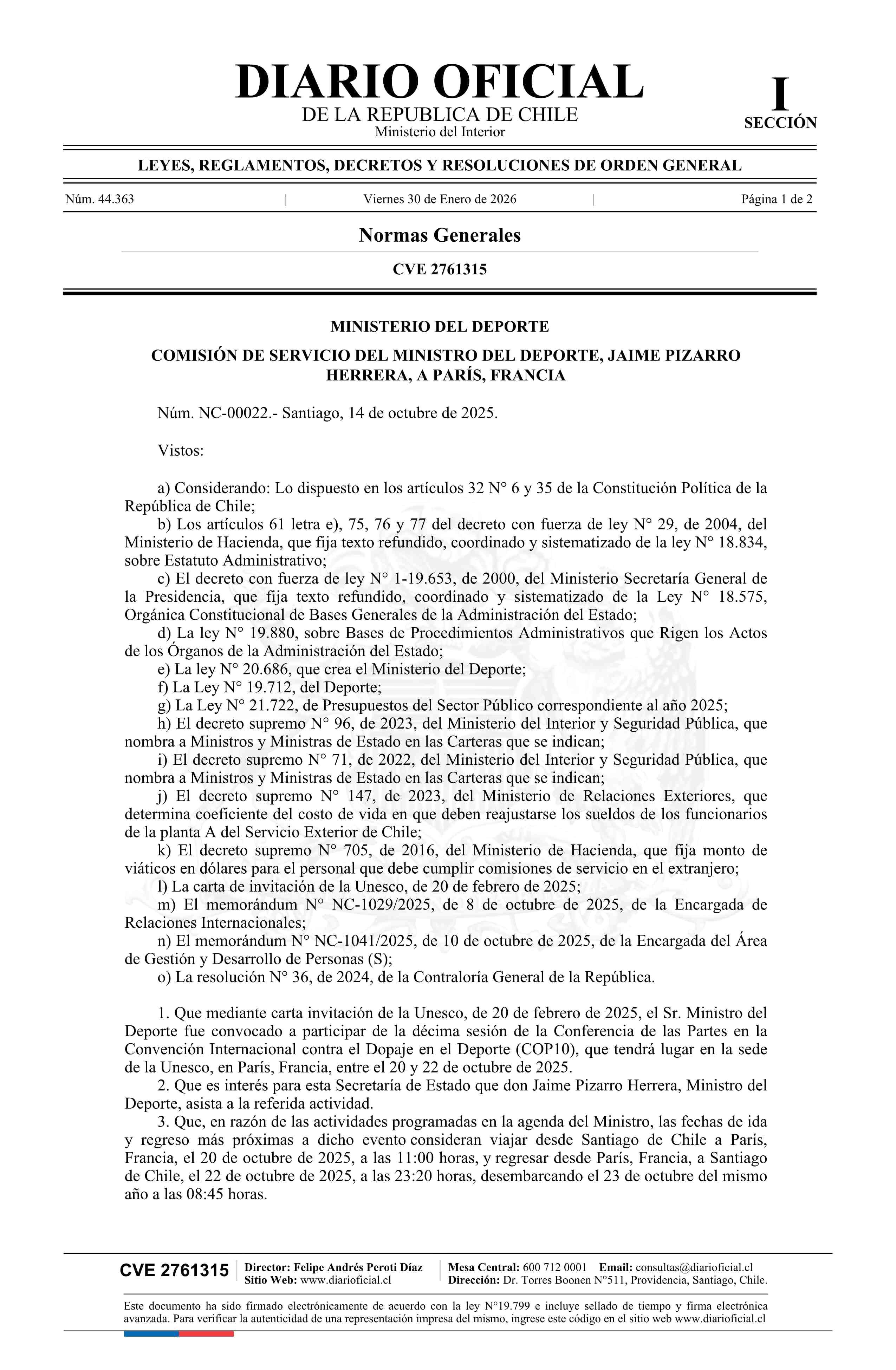 Título: Decreto número NC-00022, de 2025.- Designa a don Jaime Pizarro Herrera, Ministro del Deporte, en comisión de servicio a la ciudad de París, Francia