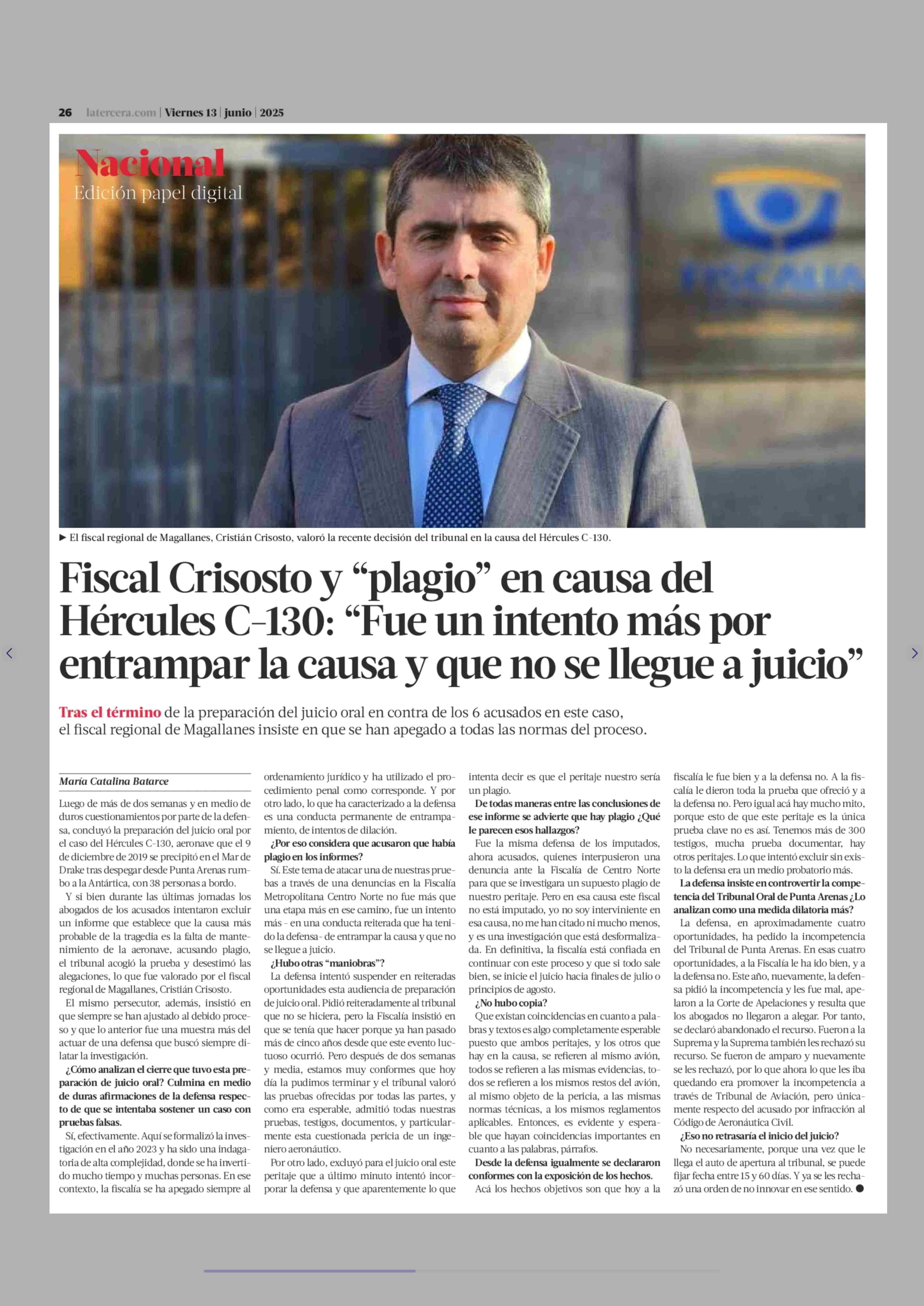 Fiscal Crisosto y “plagio” en causa del Hércules C-130: “Fue un intento más por entrampar la causa y que no se llegue a juicio” 13-06-2025 La Tercera |