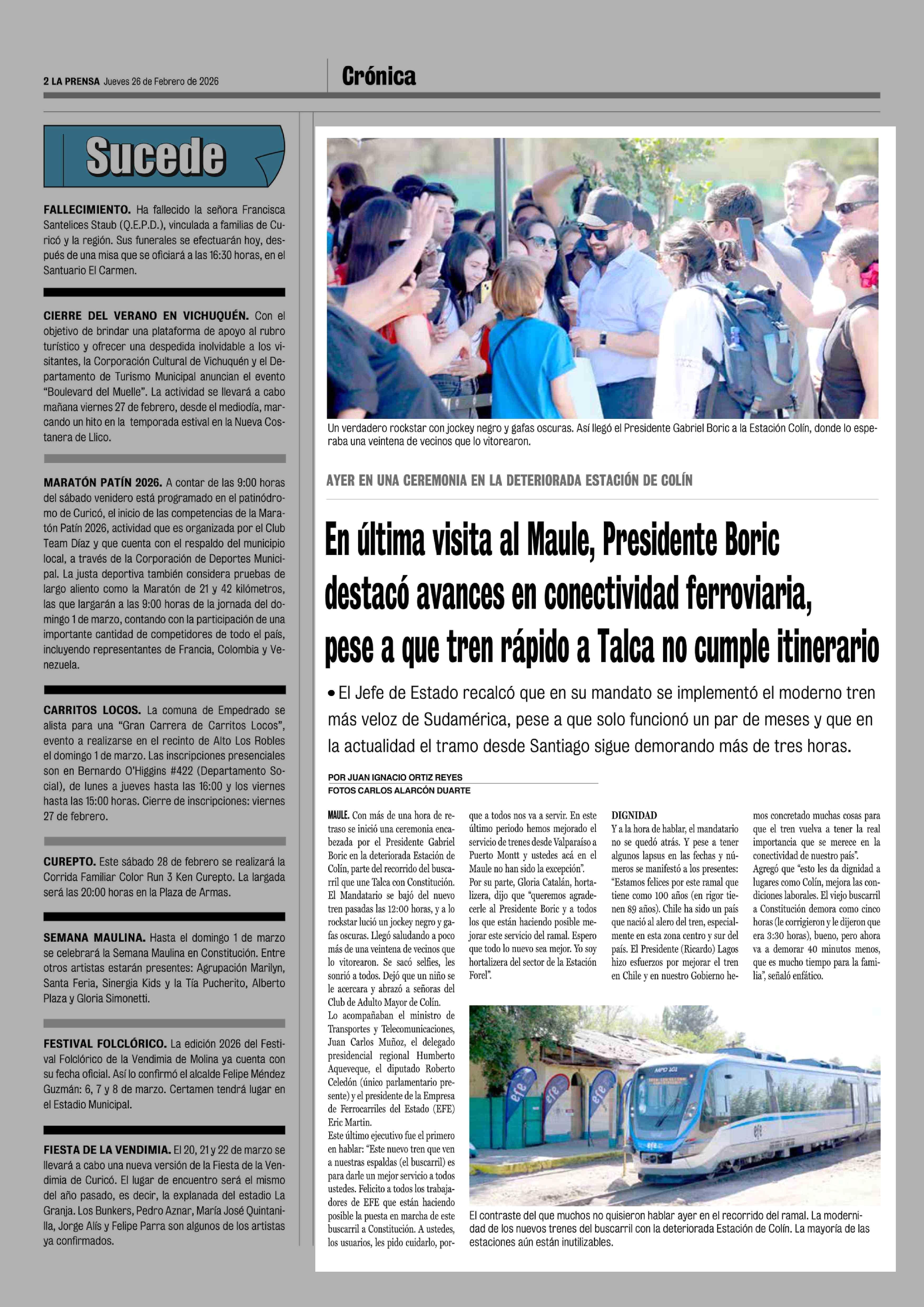 En última visita al Maule, Presidente Boric destacó avances en conectividad ferroviaria, pese a que tren rápido a Talca no cumple itinerario 26-02-2026 La Prensa de Curicó |