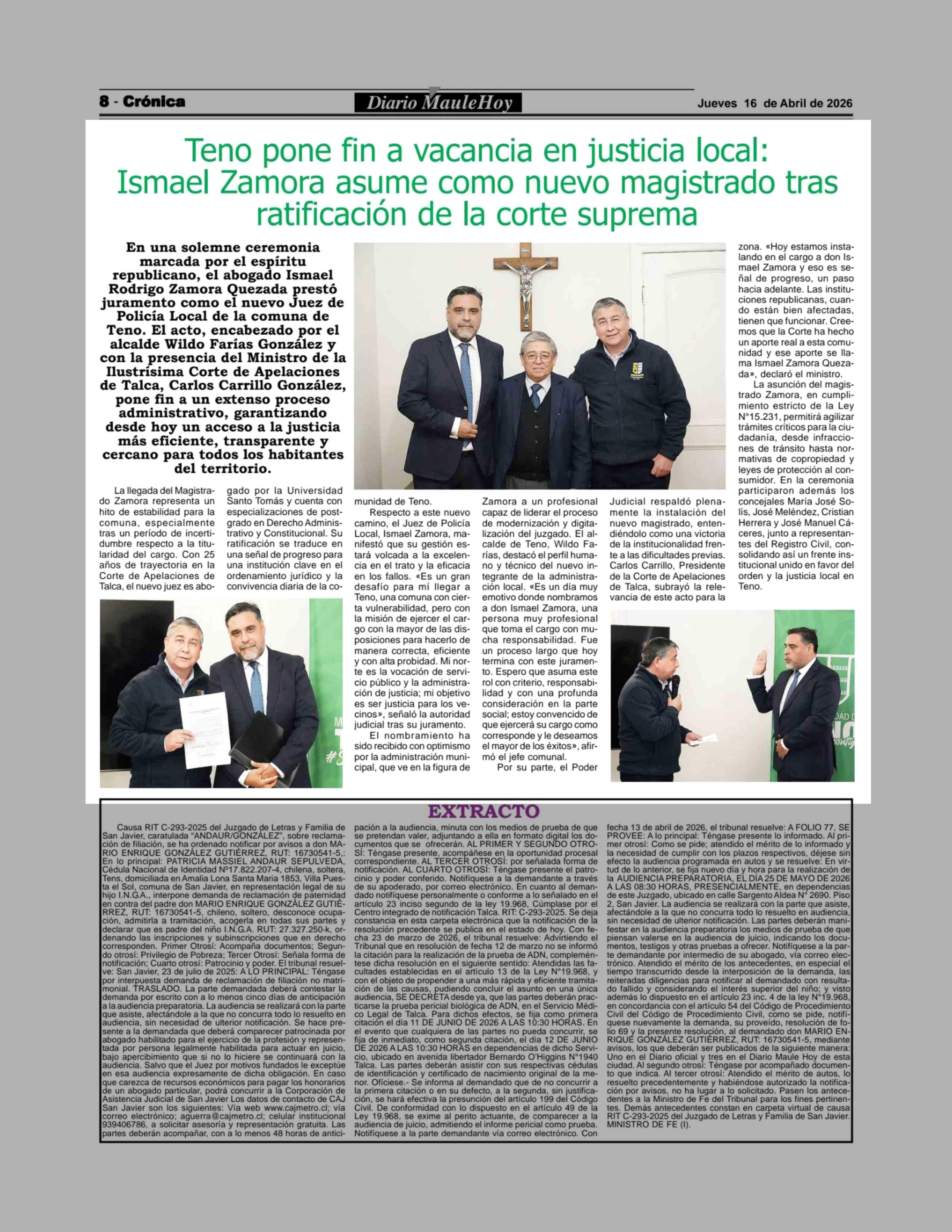 Título: Teno pone fin a vacancia en justicia local: Ismael Zamora asume como nuevo magistrado tras ratificación de la corte suprema