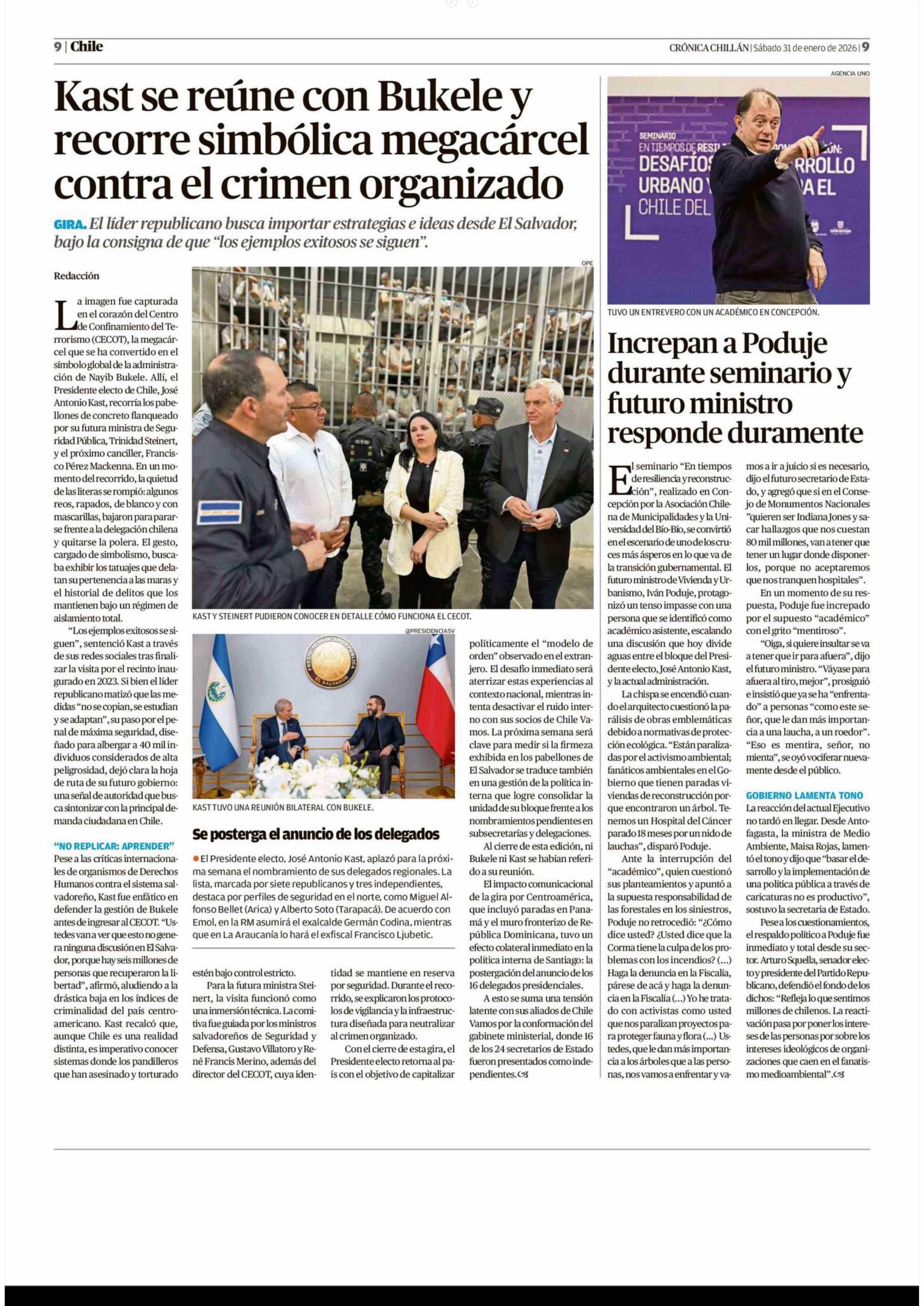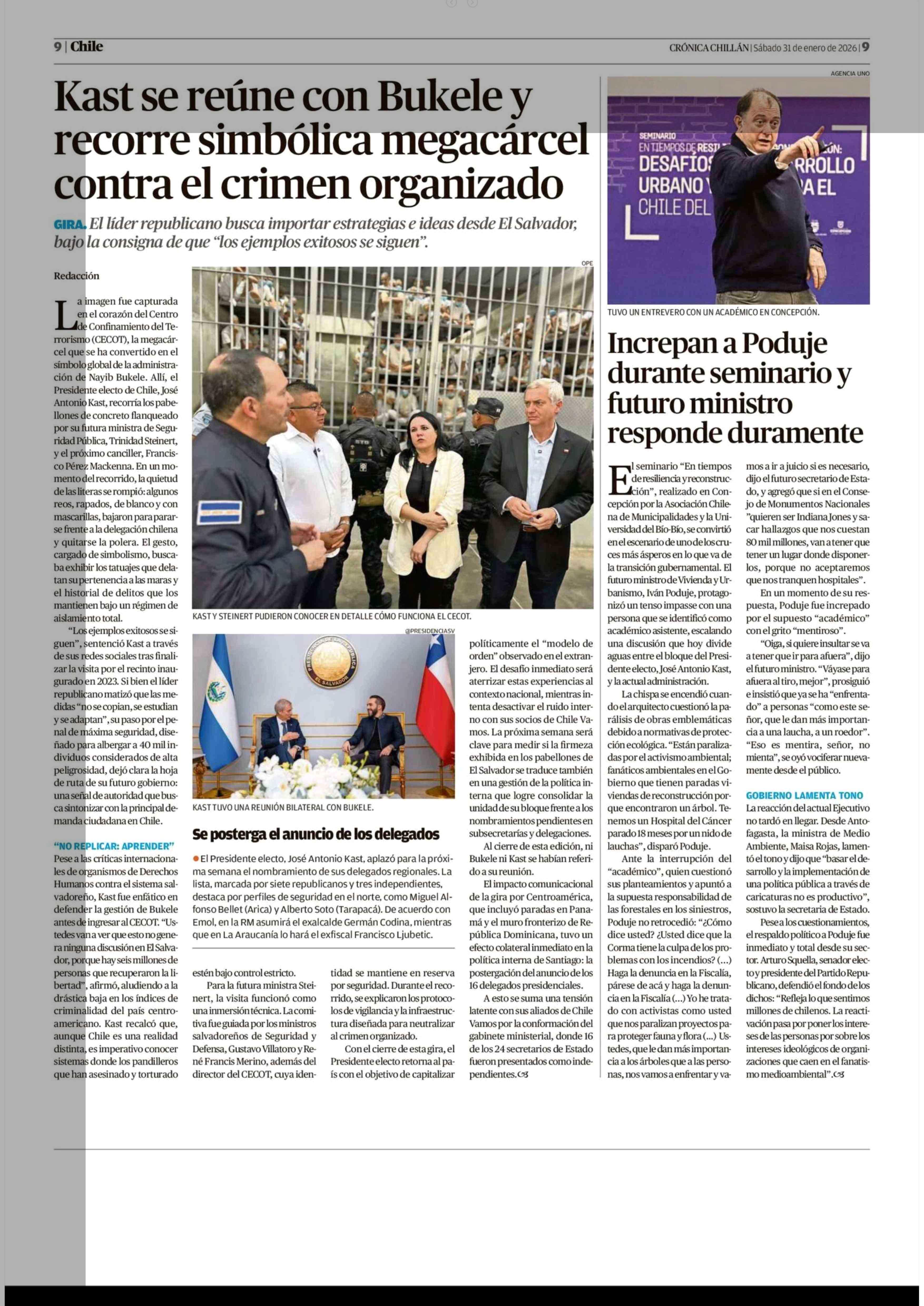 Kast se reúne con Bukele y recorre simbólica megacárcel contra el crimen organizado 31-01-2026 Crónica de Chillán |