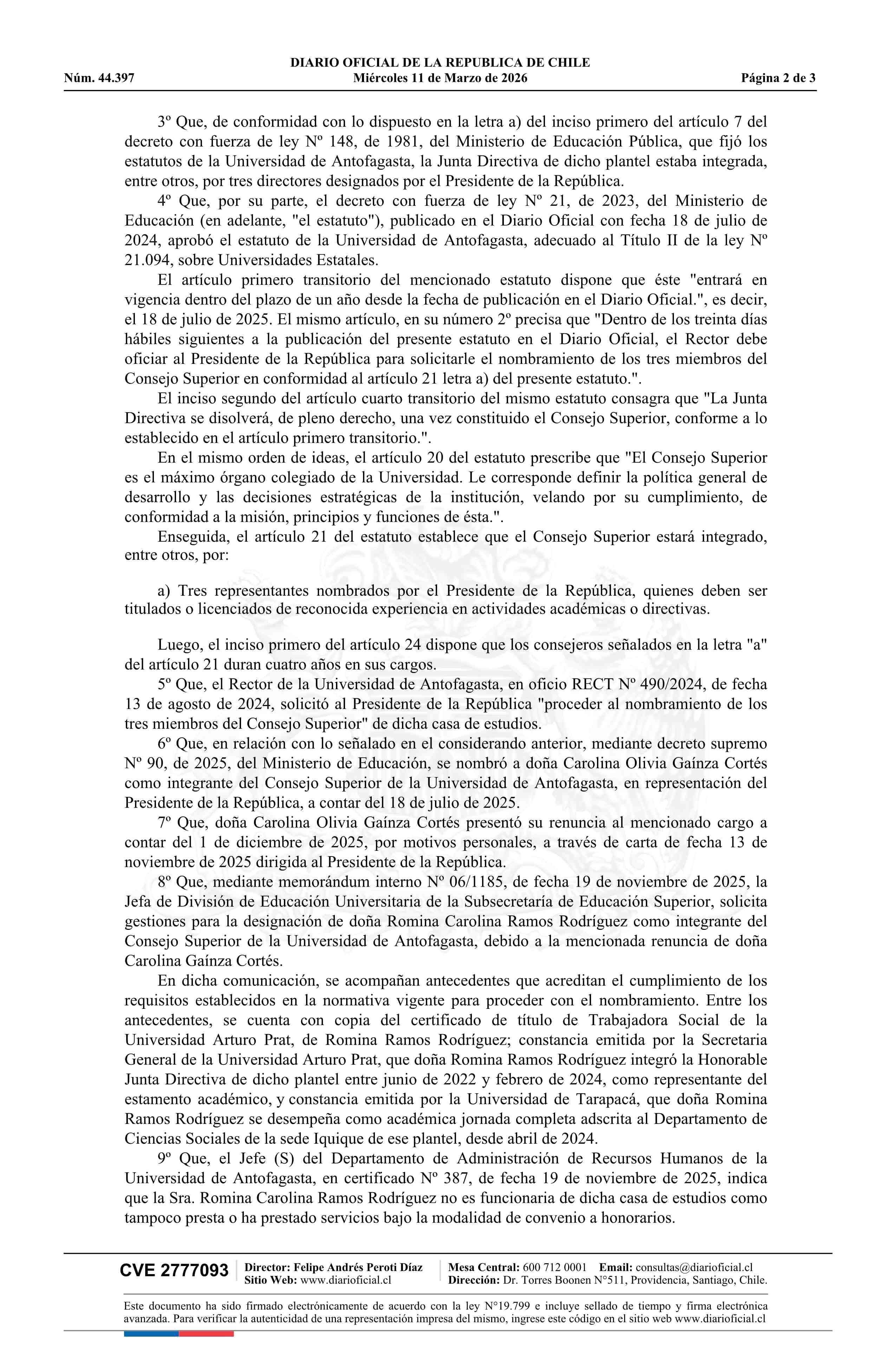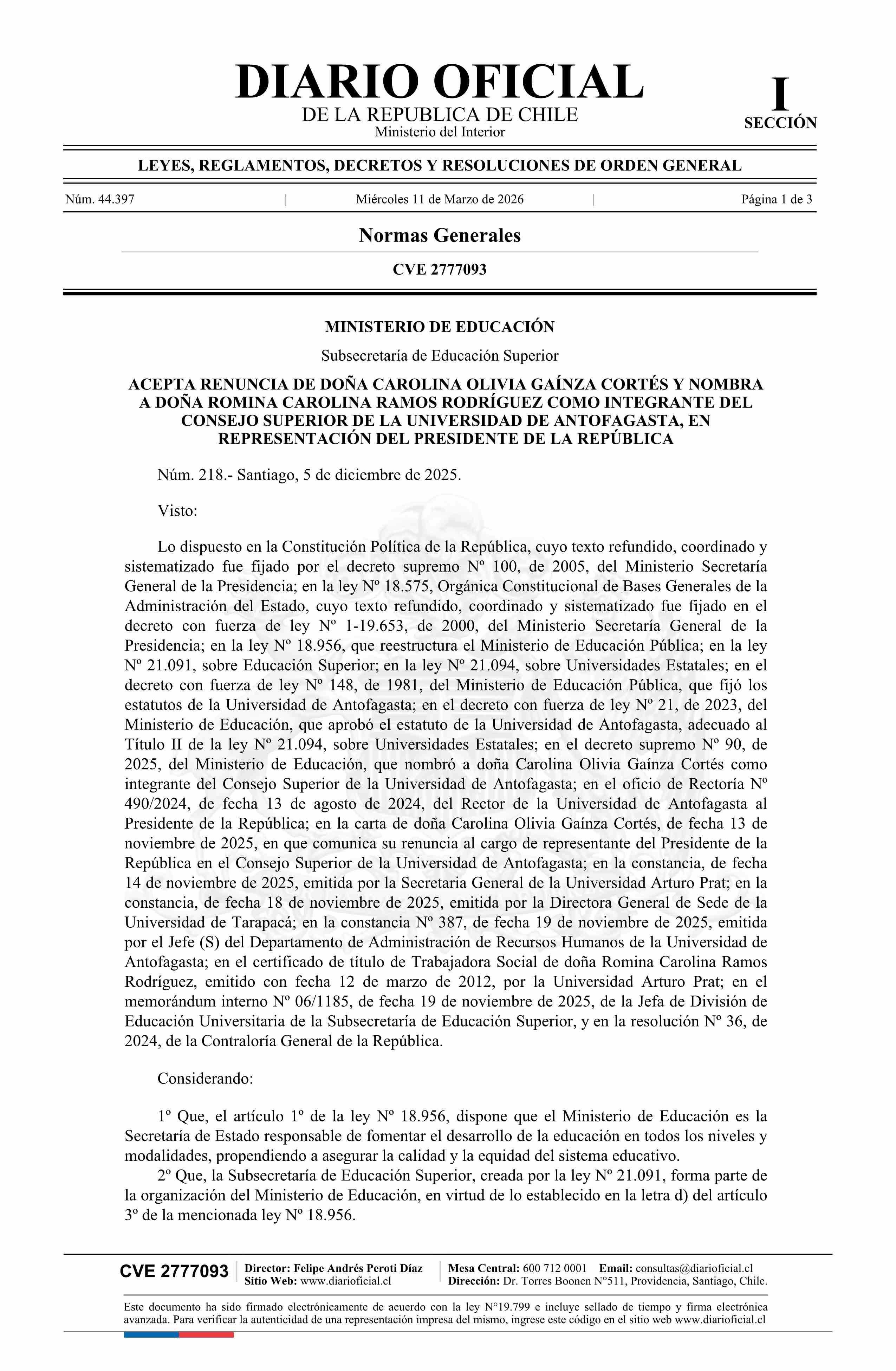 Título: Decreto número 218, de 2025.- Acepta renuncia de doña Carolina Olivia Gaínza Cortés y nombra a doña Romina Carolina Ramos Rodríguez como integrante del Consejo Superior de la Universidad de Antofagasta, en representación del Presidente de la República