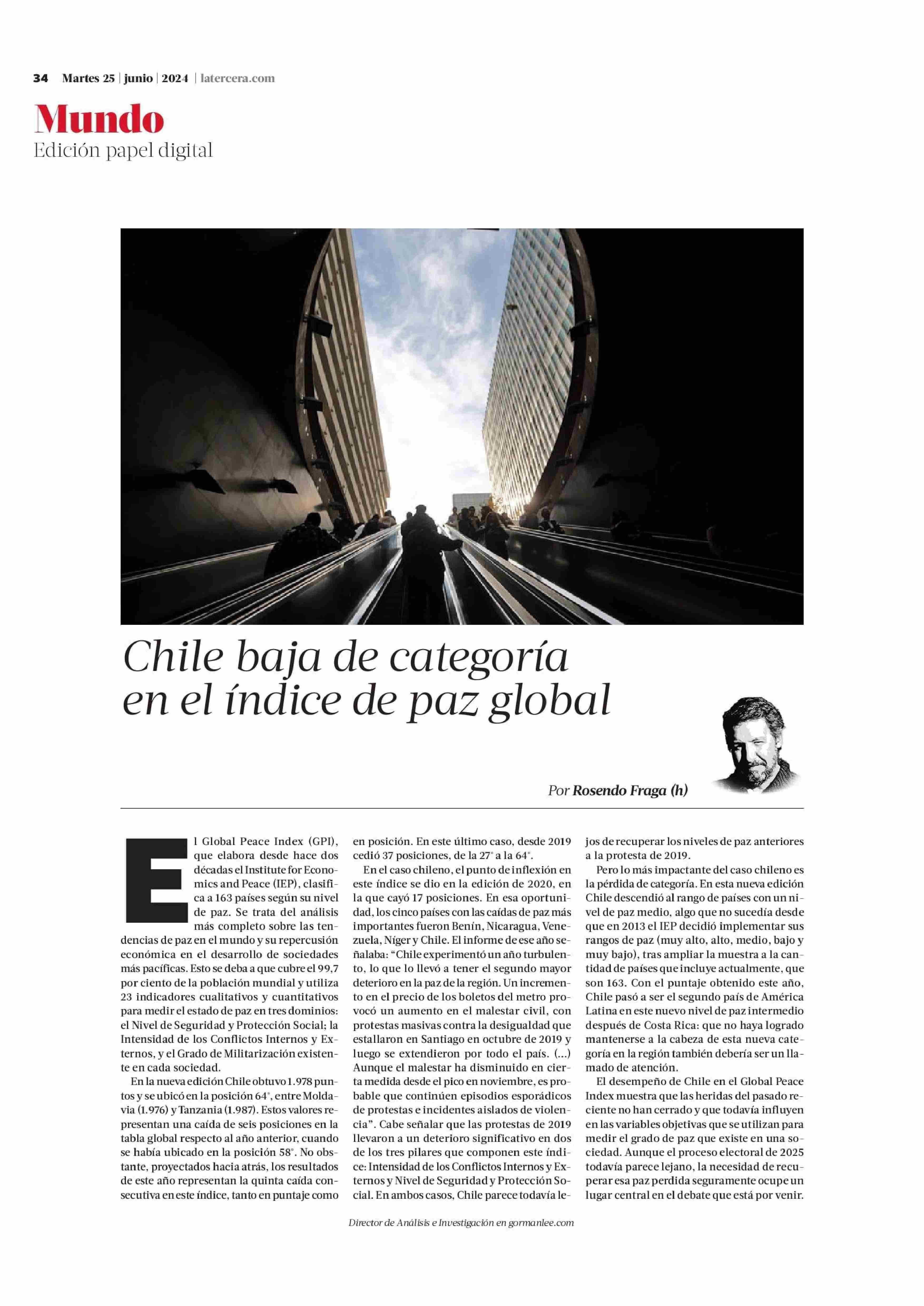 COLUMNAS DE OPINIÓN: Chile baja de categoría en el índice de paz global 25-06-2024 La Tercera |