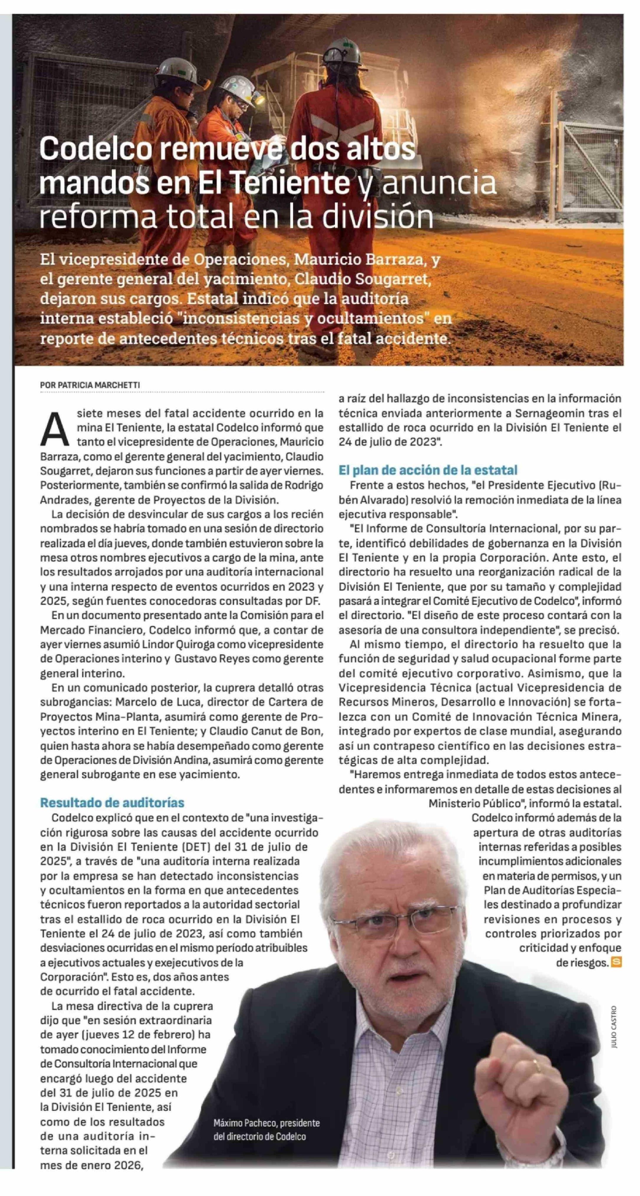Título: Codelco remueve dos altos mandos en El Teniente y anuncia reforma total en la división