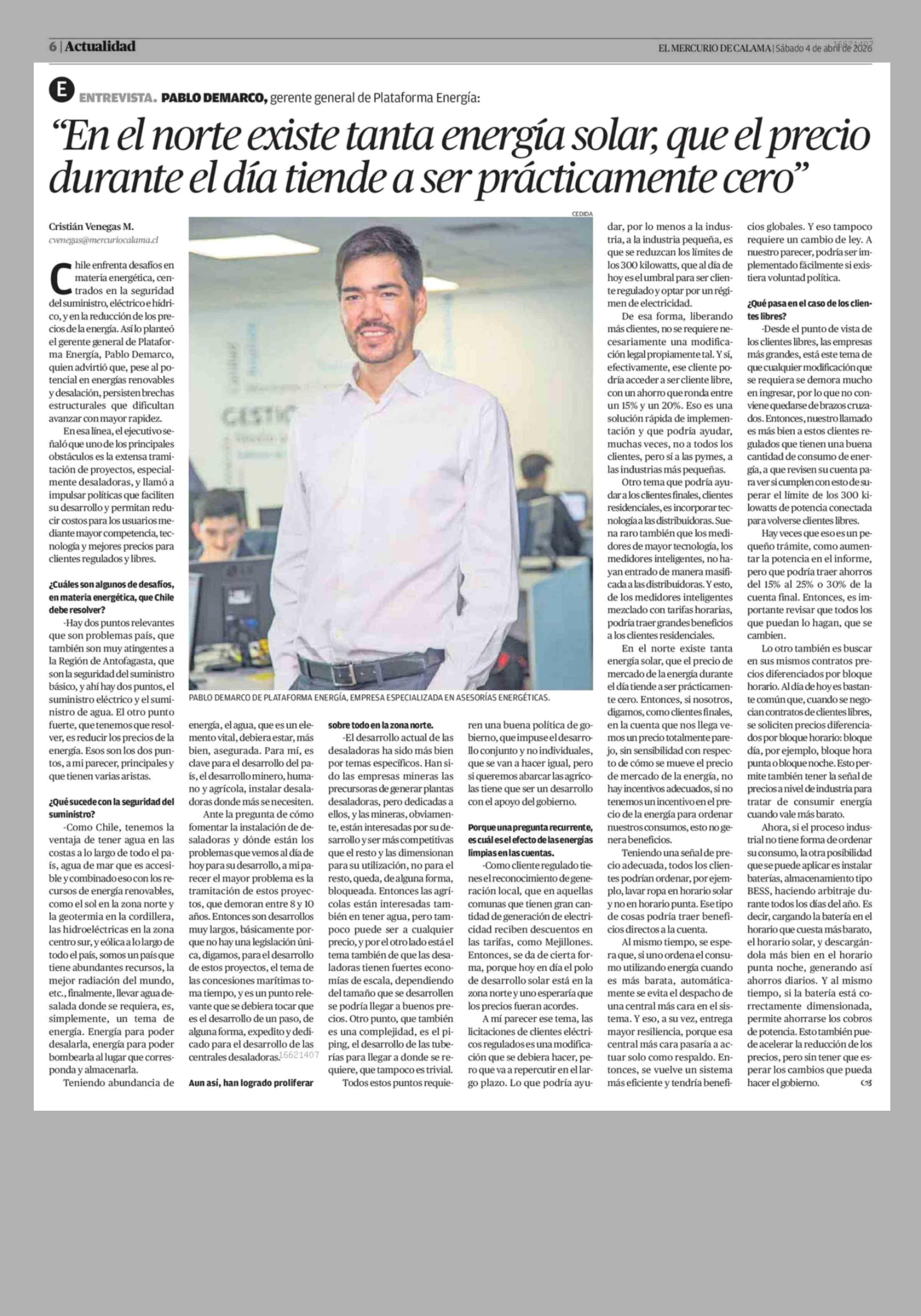 "En el norte existe tanta energía solar, que el precio durante el día tiende a ser prácticamente cero" 04-04-2026 El Mercurio de Calama |