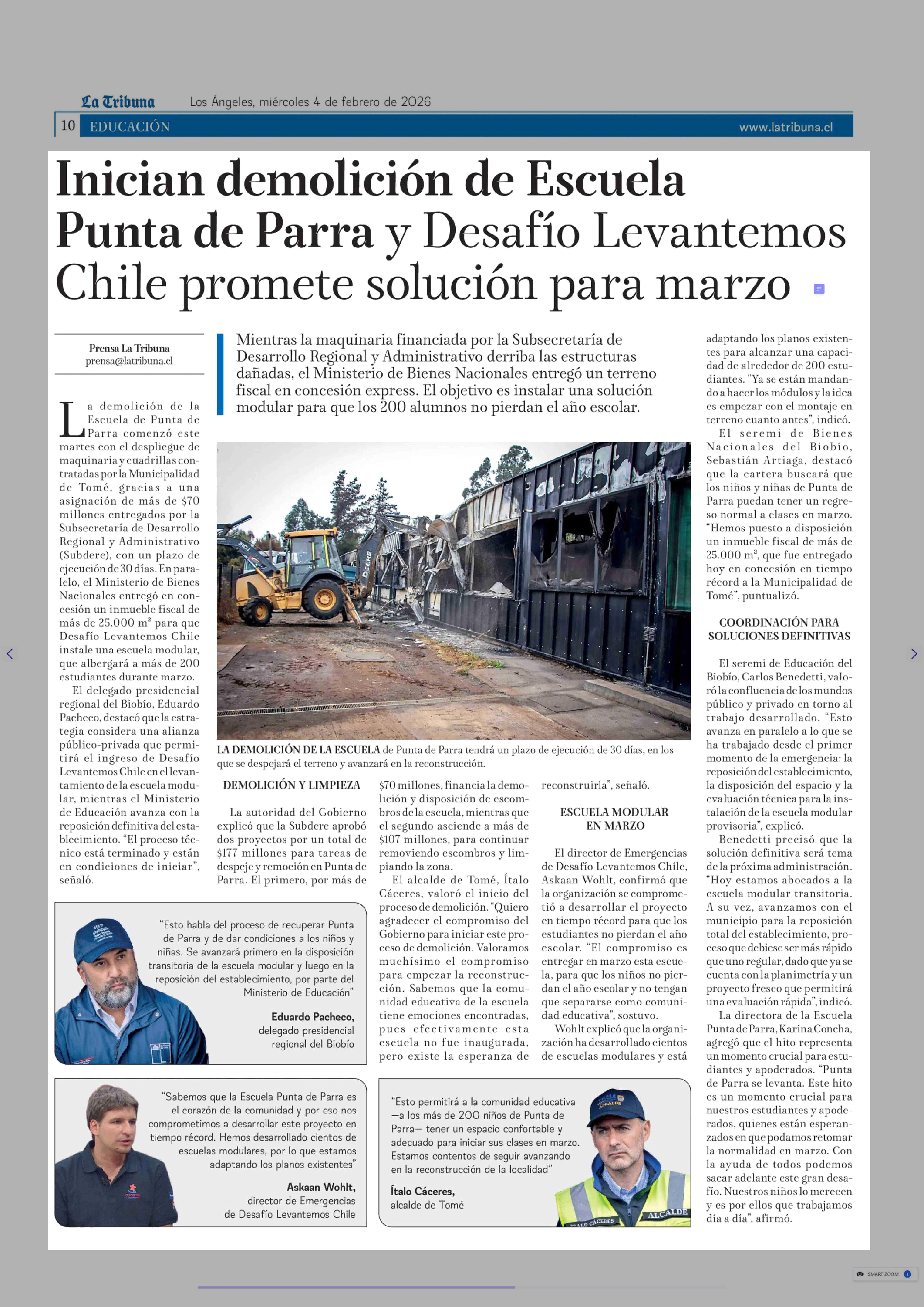 Título: Inician demolición de Escuela Punta de Parra y Desafío Levantemos Chile promete solución para marzo