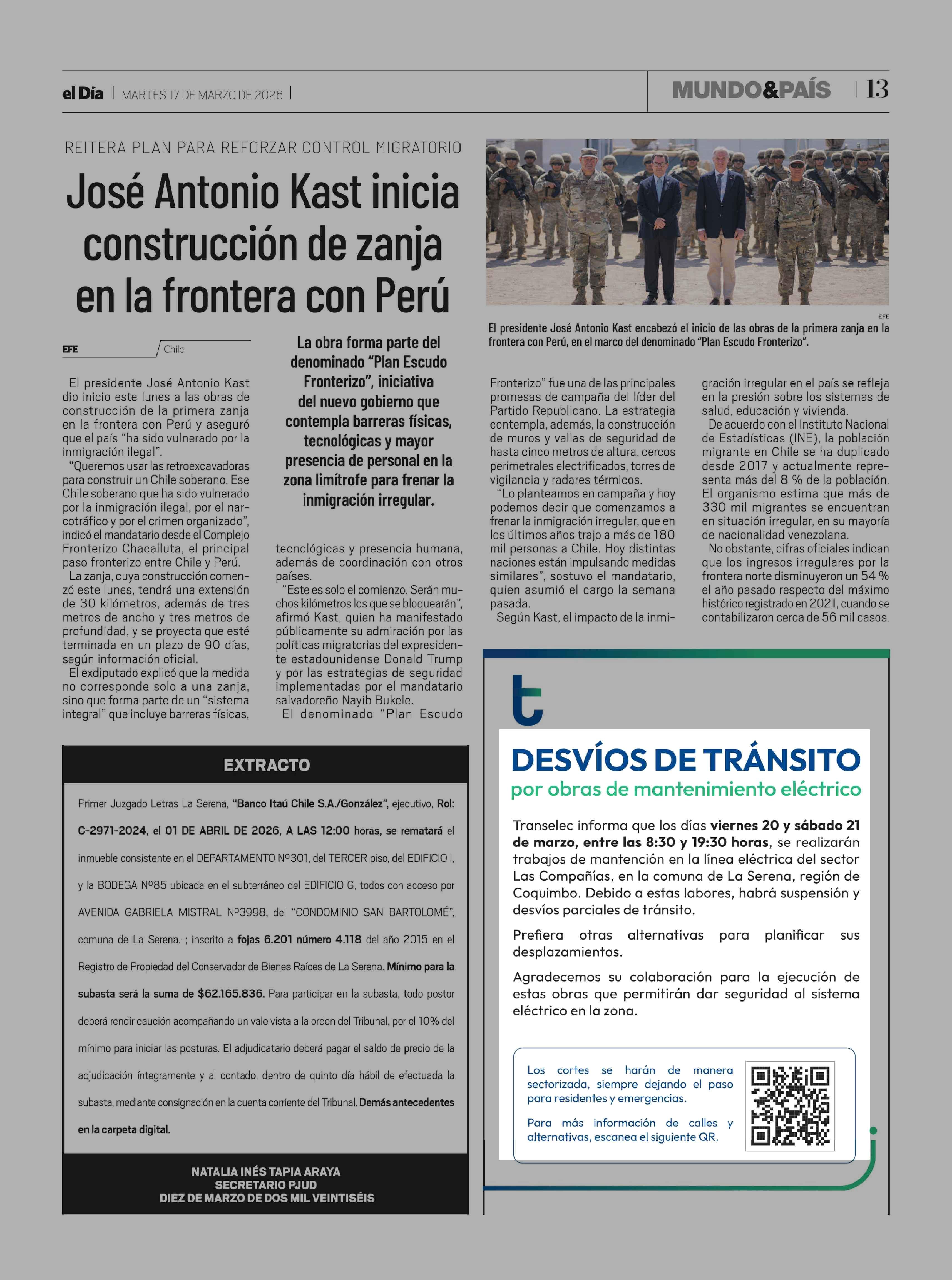 Extractos: DESVÍOS DE TRÁNSITO por obras de mantenimiento eléctrico 17-03-2026 El Día |