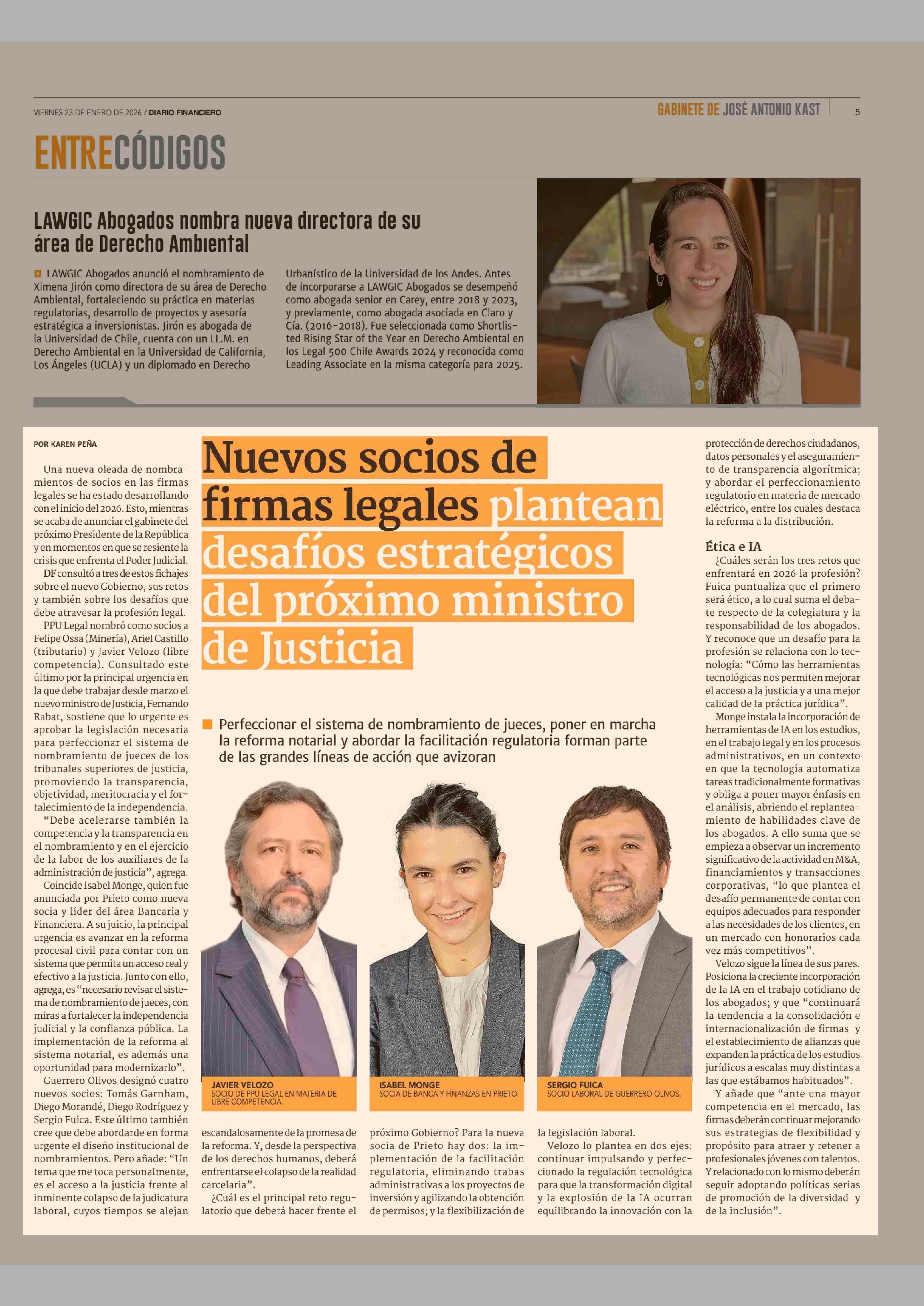 Nuevos socios de firmas legales plantean desafíos estratégicos del próximo ministro de Justicia 23-01-2026 Diario Financiero |
