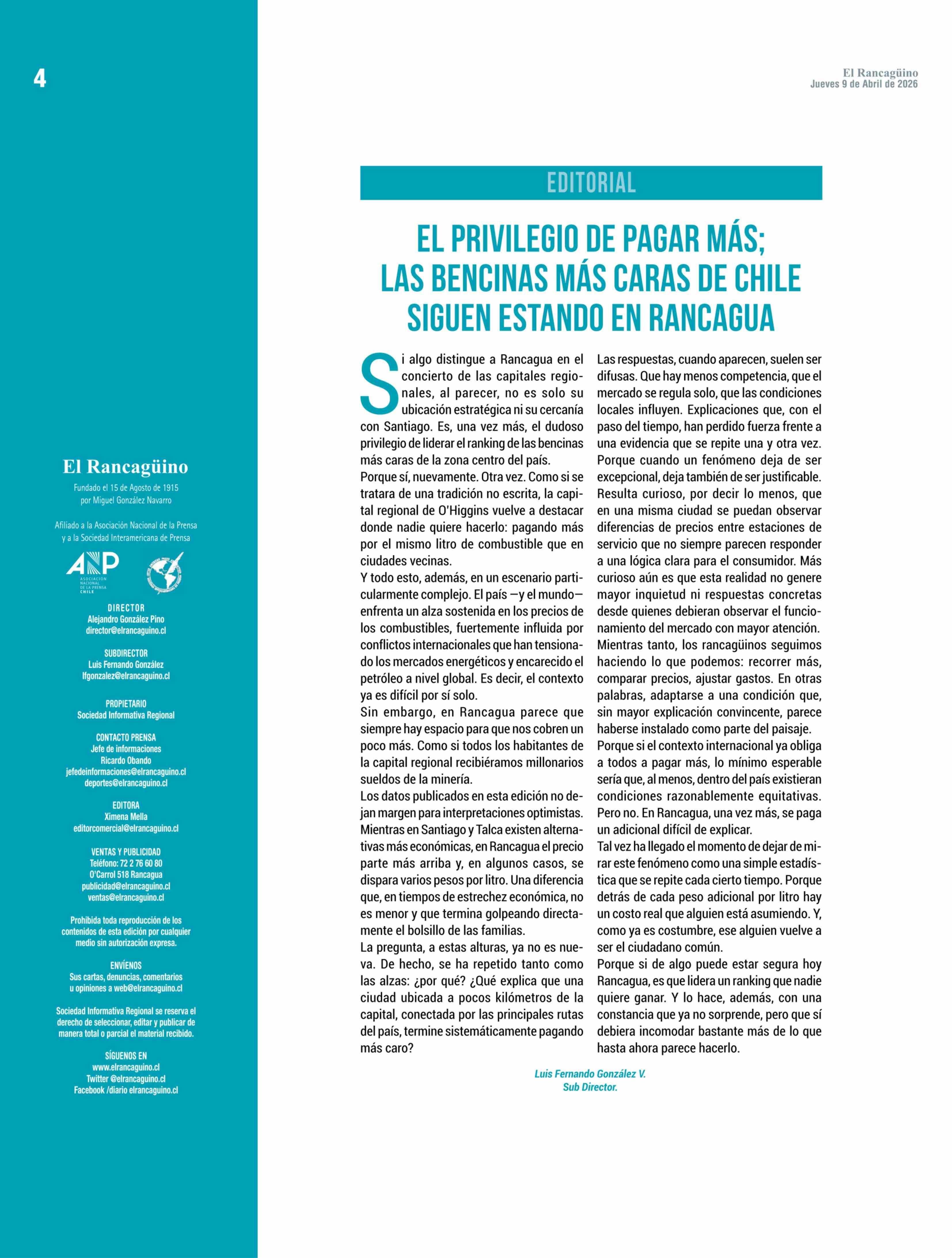 Editorial: EL PRIVILEGIO DE PAGAR MÁS; LAS BENCINAS MÁS CARAS DE CHILE SIGUEN ESTANDO EN RANCAGUA 09-04-2026 El Rancagüino |