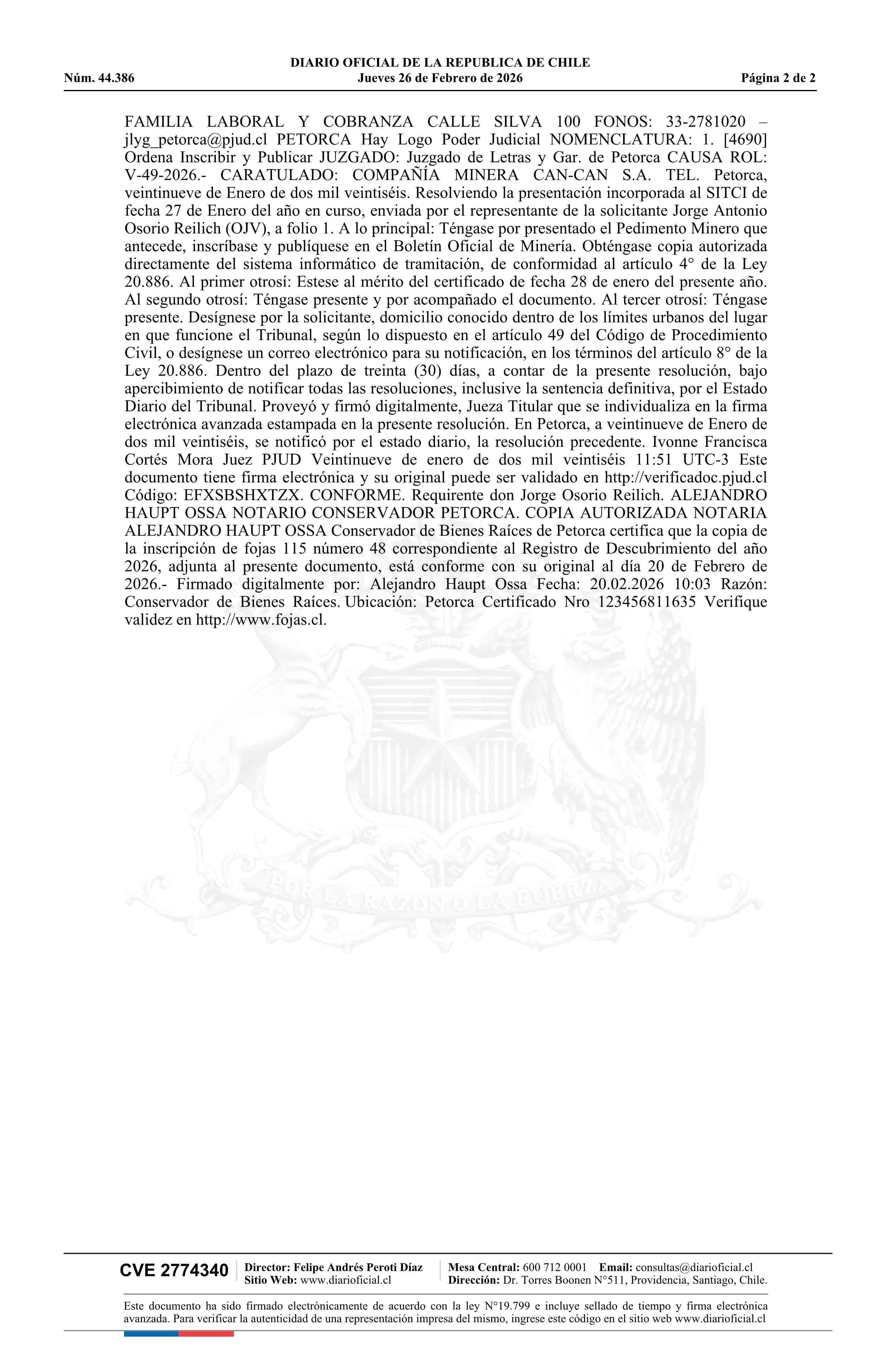 AMANDA 8 / Compañía Minera Can-Can S.A. 26-02-2026 DIARIO OFICIAL CHILE - BOLETÍN OFICIAL DE MINERÍA |