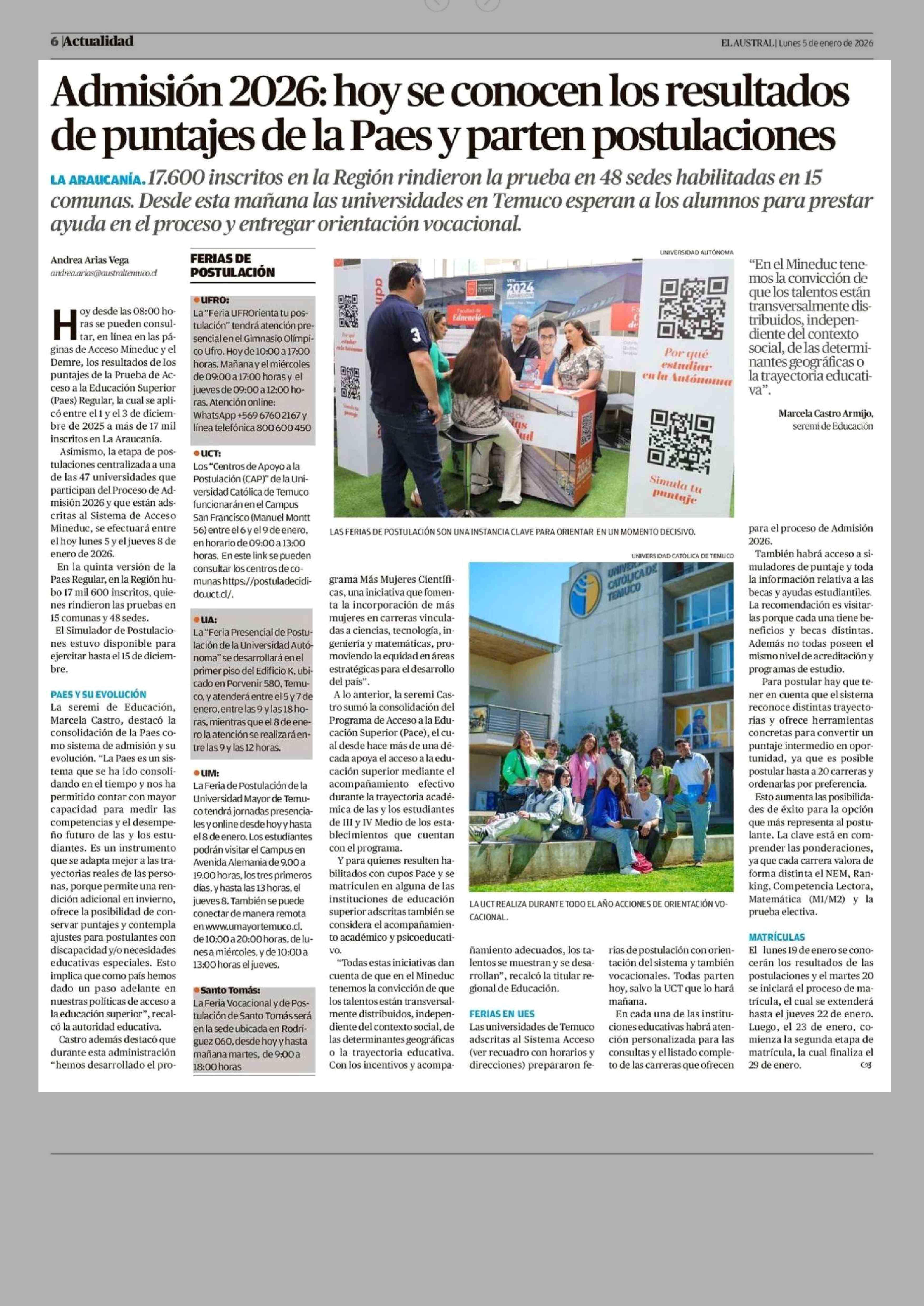 Admisión 2026: hoy se conocen los resultados de puntajes de la Paes y parten postulaciones 05-01-2026 El Austral de la Araucanía |