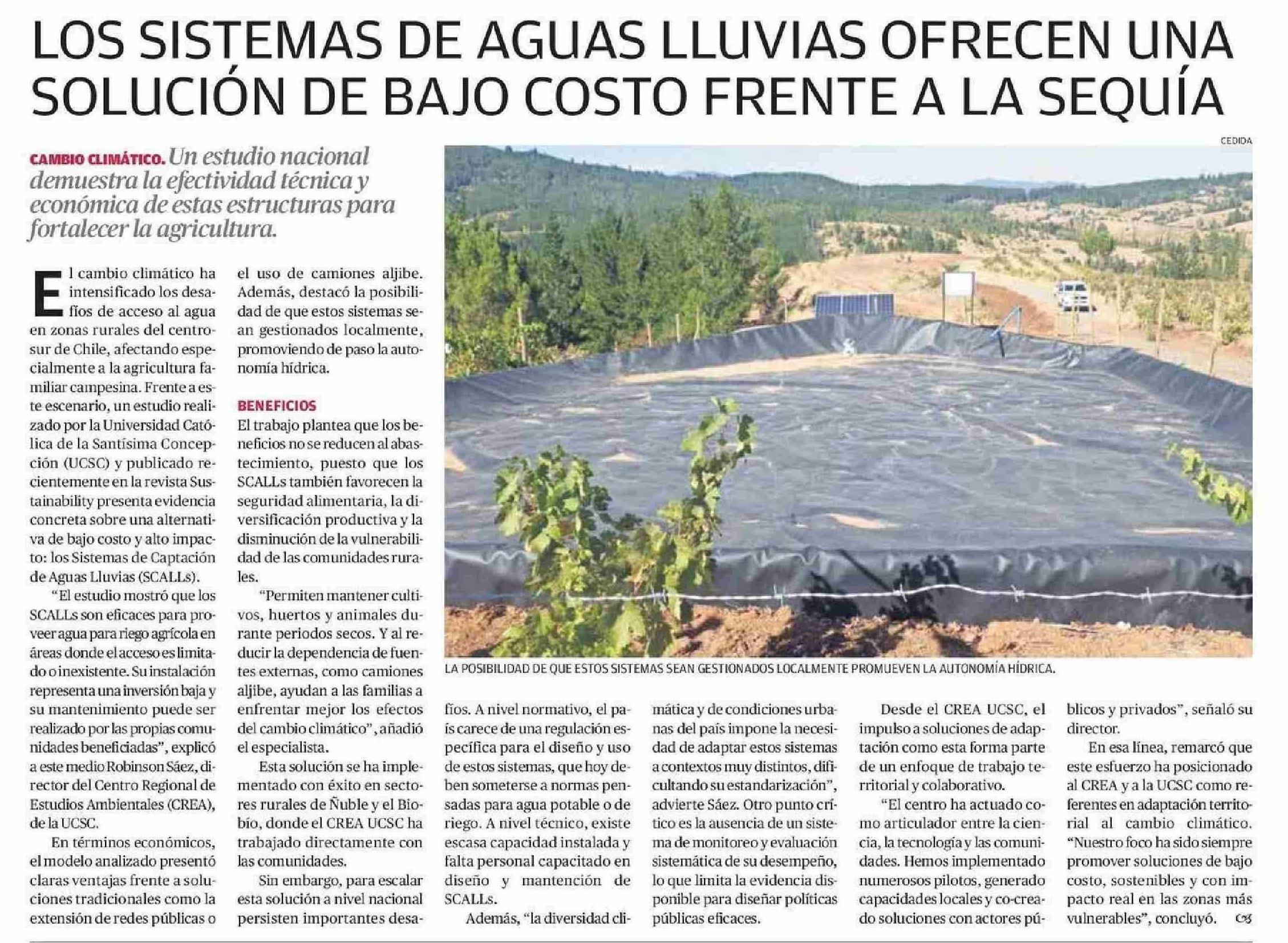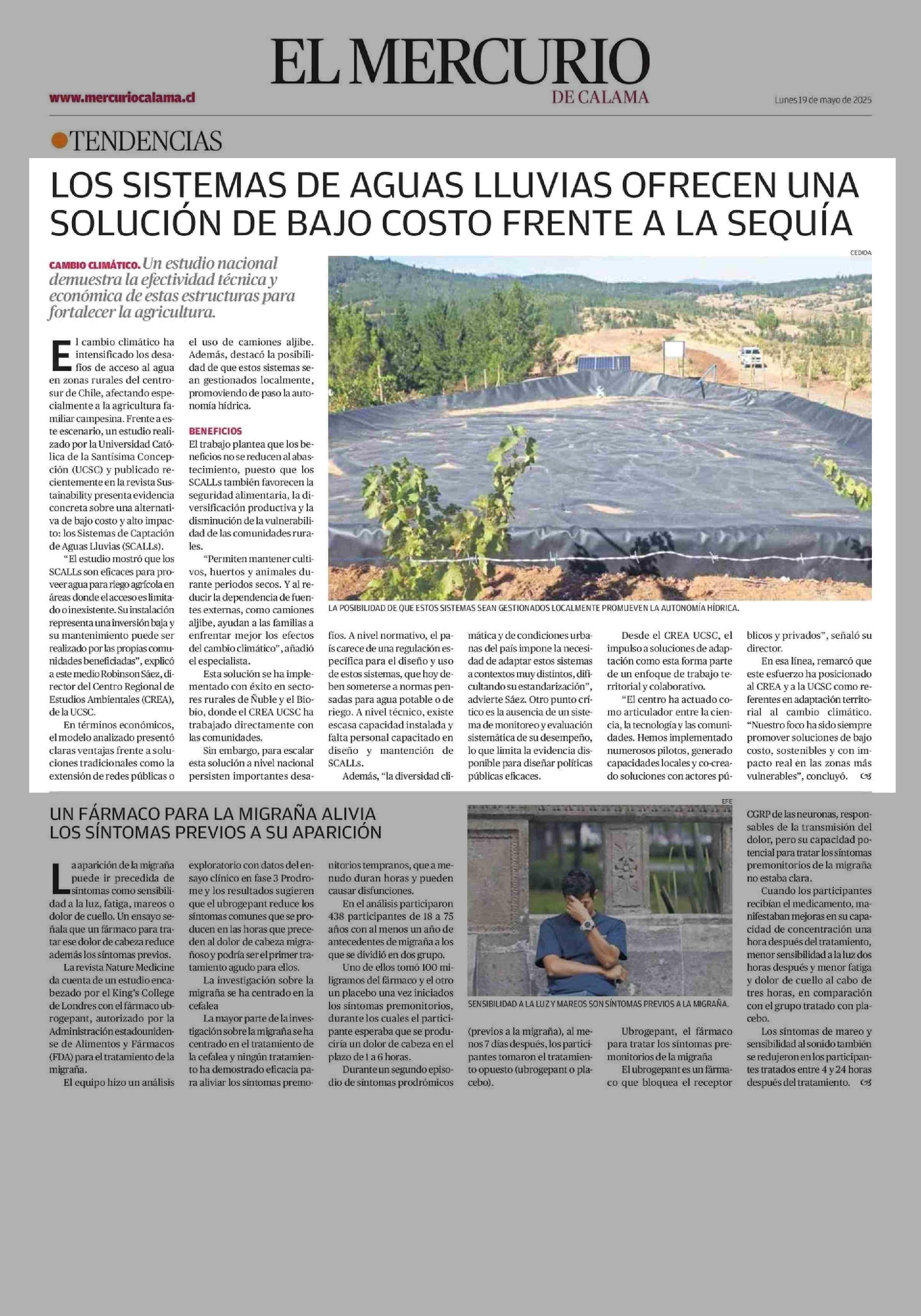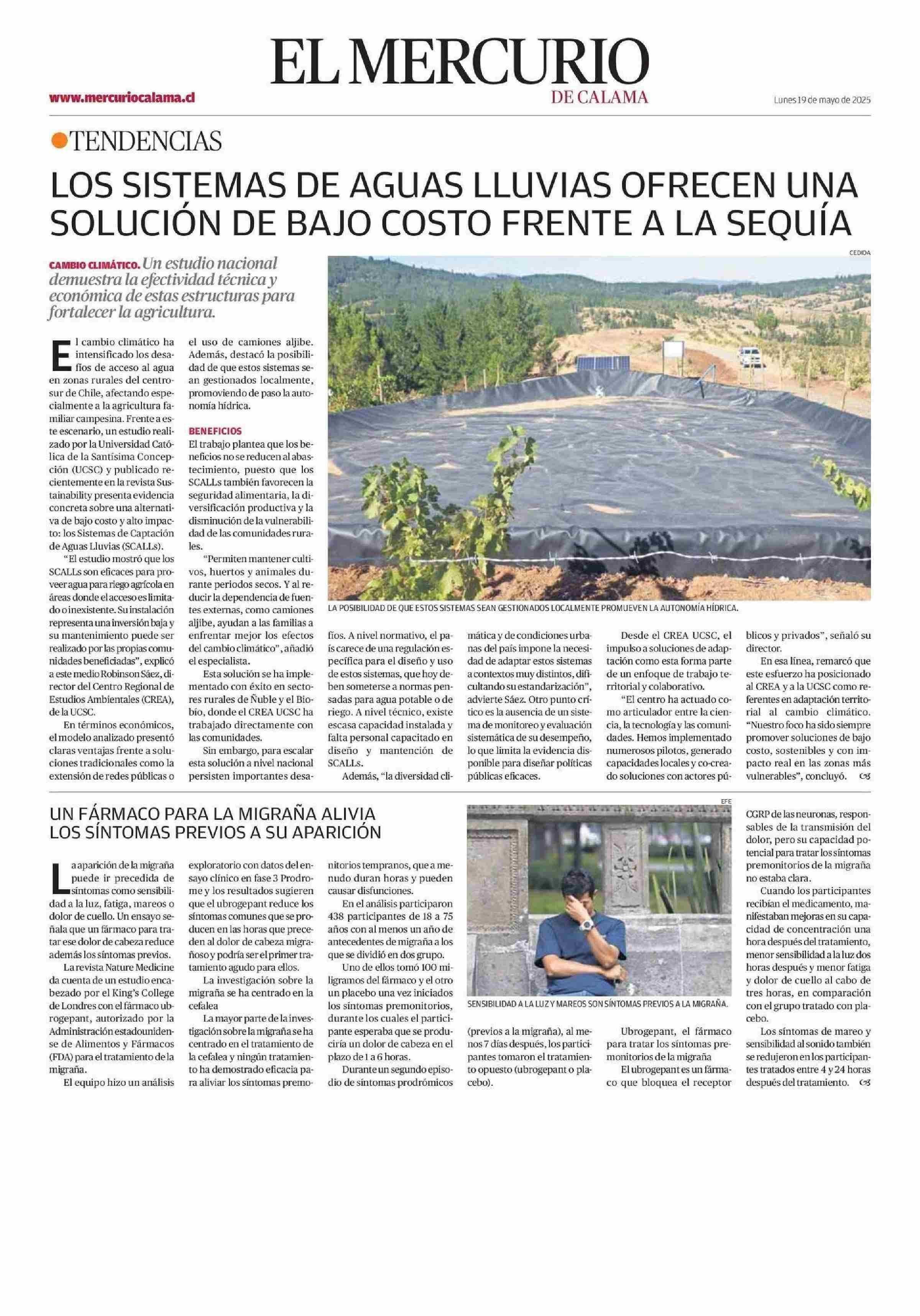 LOS SISTEMAS DE AGUAS LLUVIAS OFRECEN UNA SOLUCION DE BAJO COSTO FRENTE A LA SEQUIA 19-05-2025 El Mercurio de Calama |