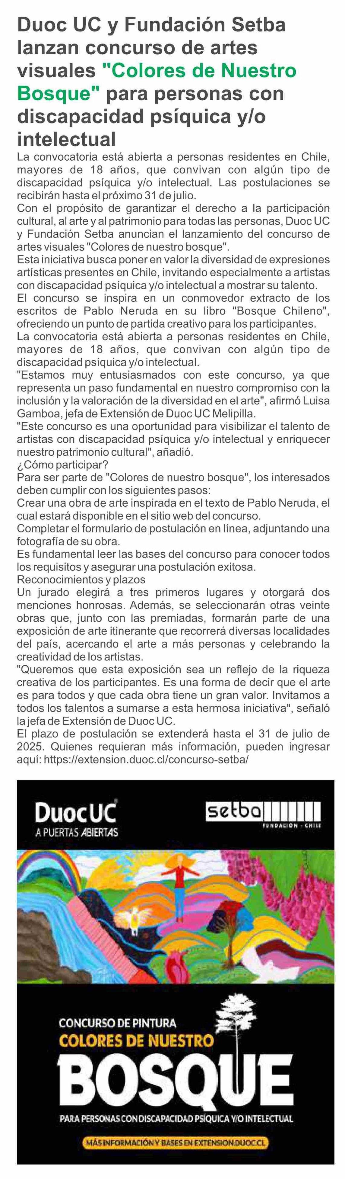 | Título: | Duoc UC y Fundación Setba lanzan concurso de artes visuales "Colores de Nuestro Bosque" para personas con discapacidad psíquica y/o intelectual |