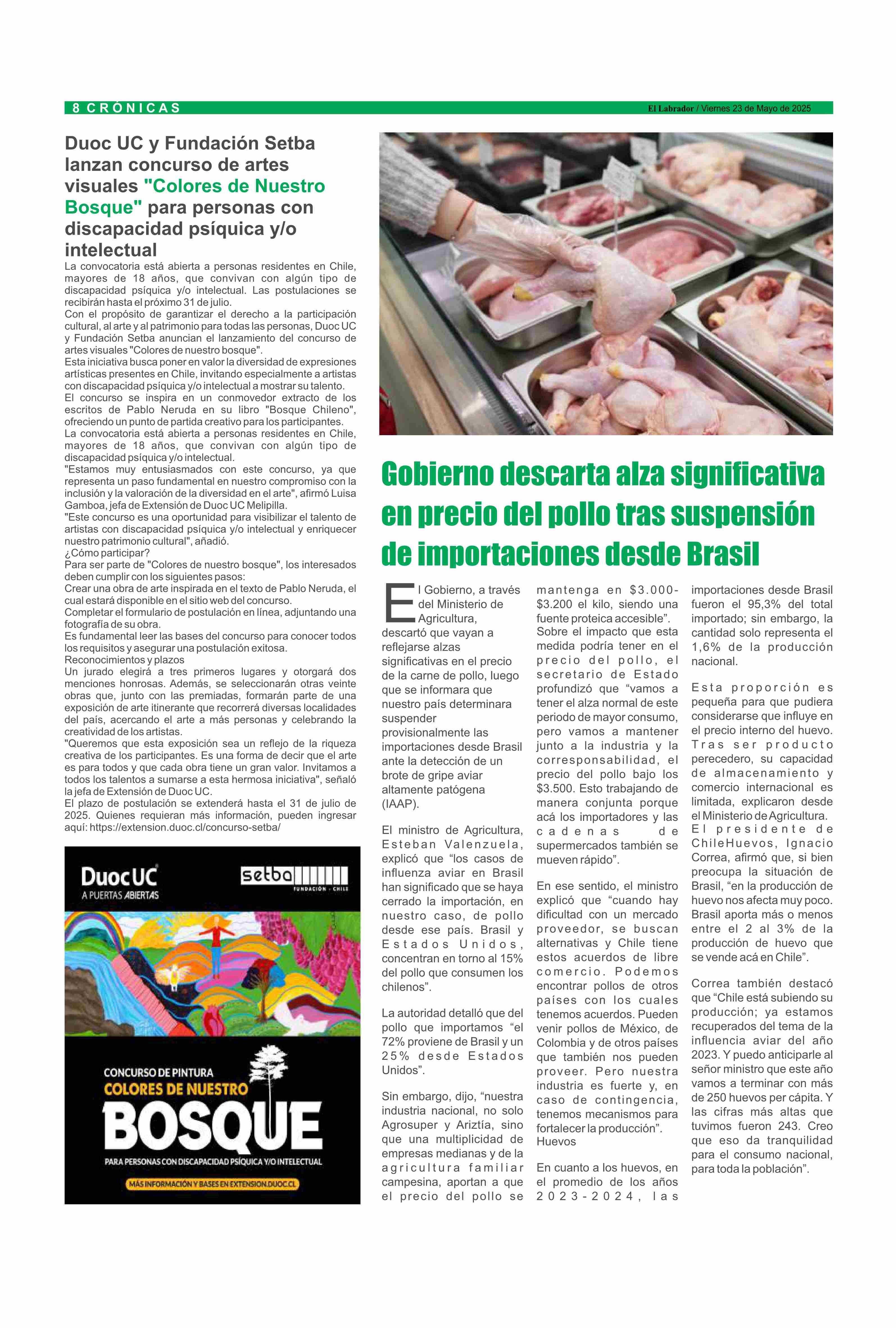 Duoc UC y Fundación Setba lanzan concurso de artes visuales "Colores de Nuestro Bosque" para personas con discapacidad psíquica y/o intelectual 23-05-2025 El Labrador |