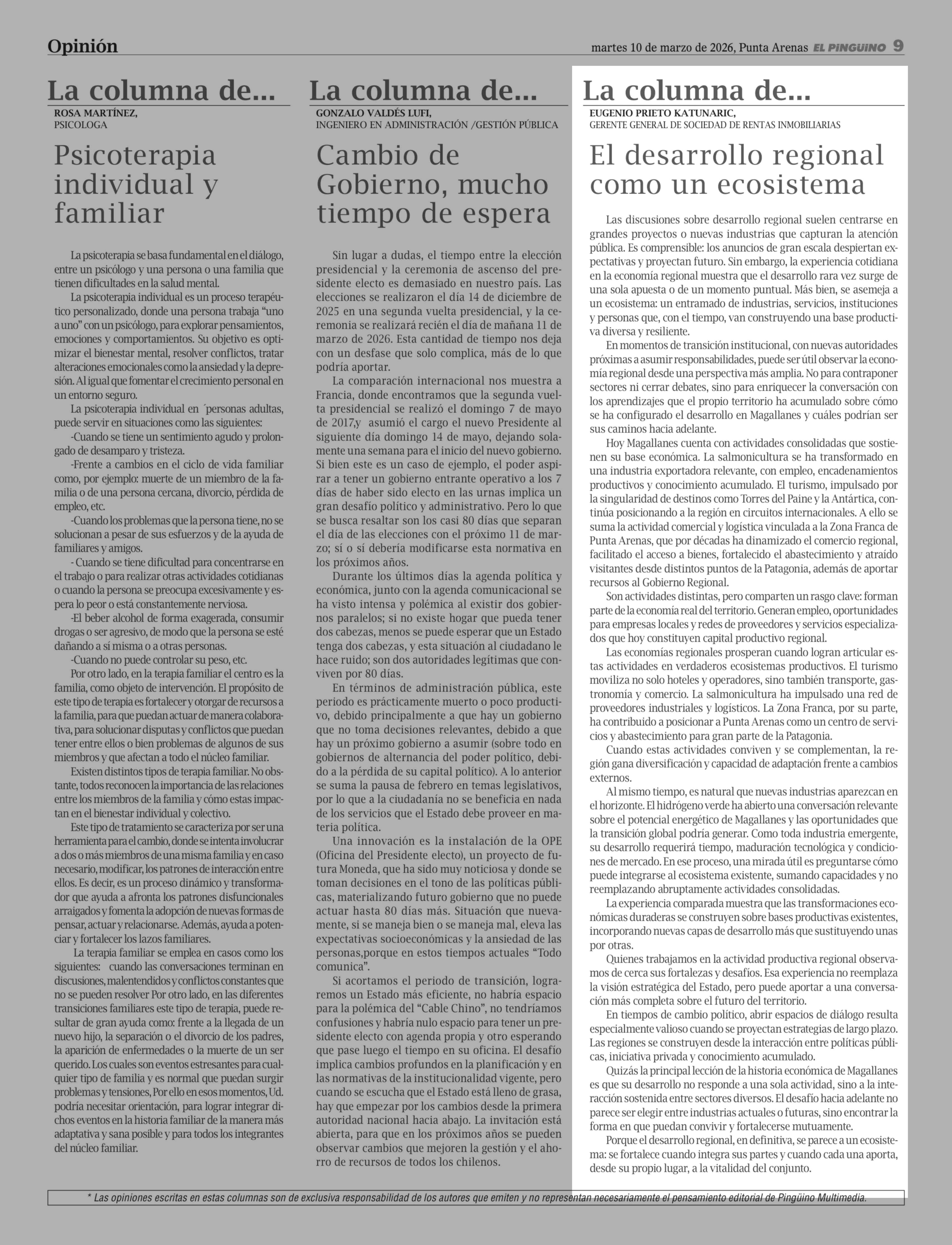 Columnas de Opinión: El desarrollo regional como un ecosistema 10-03-2026 El Pingüino |