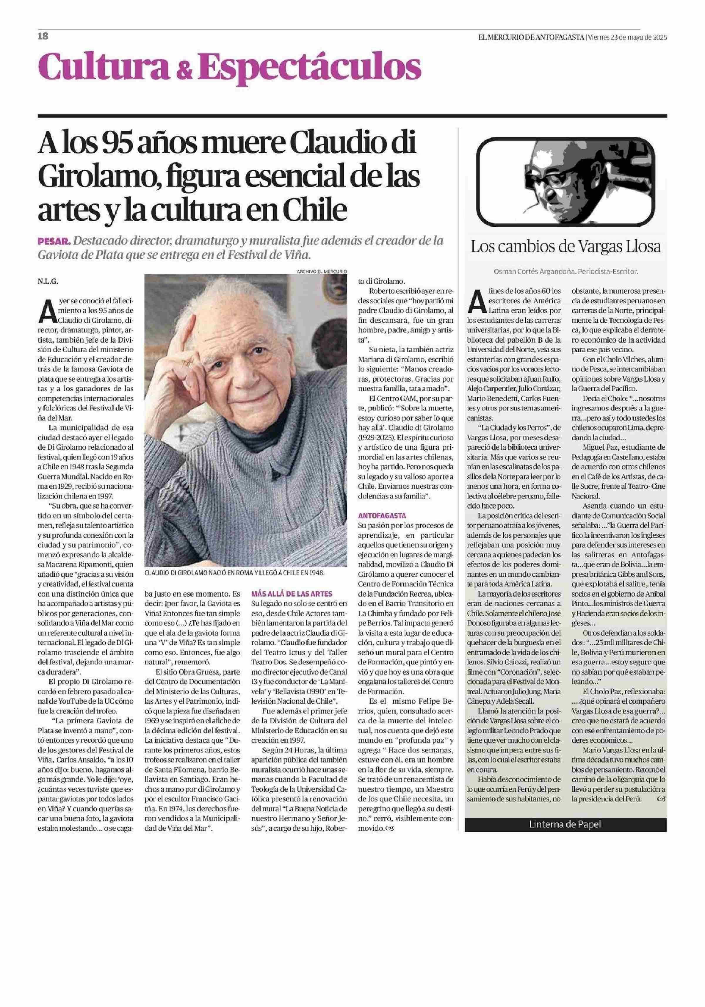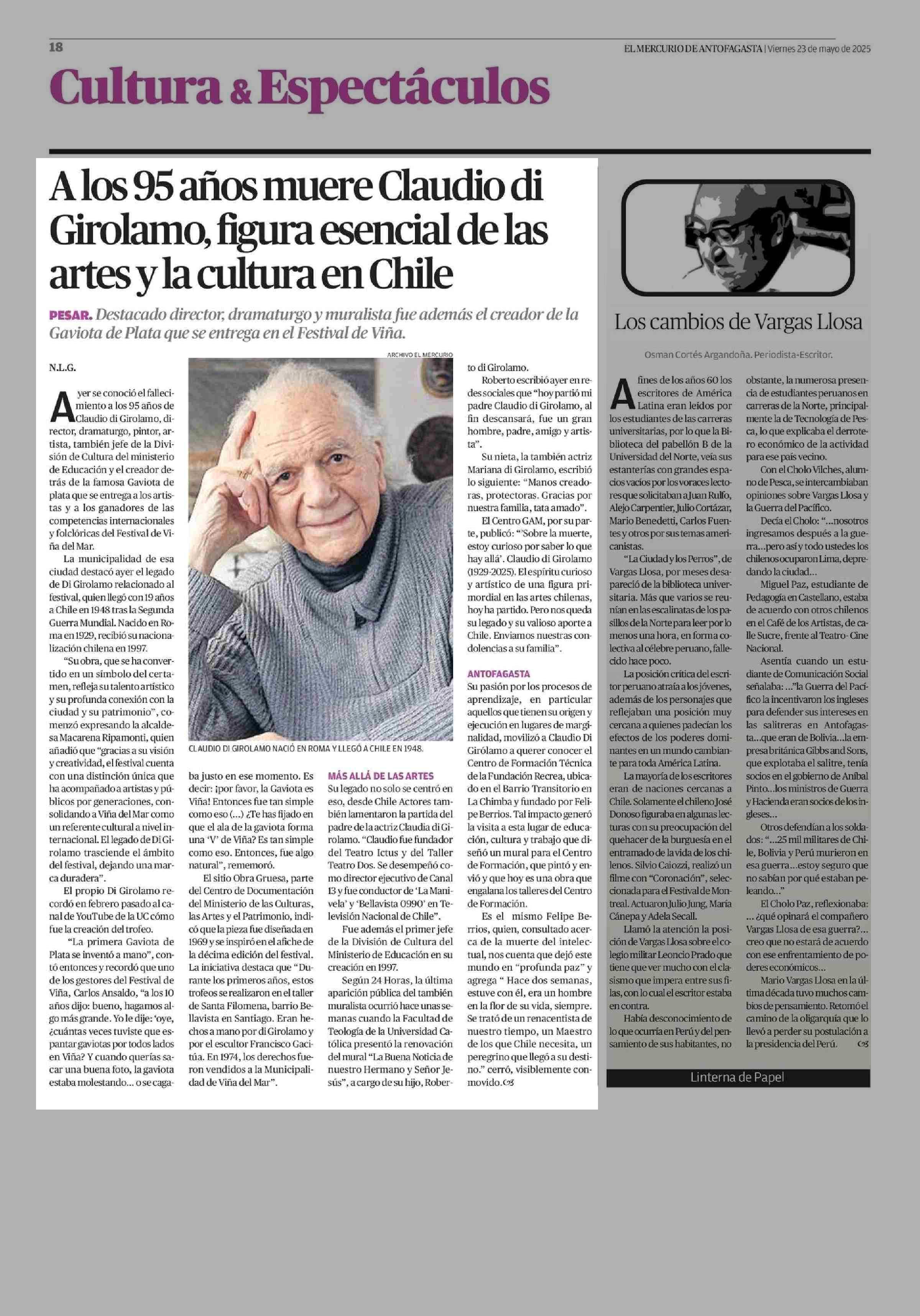 Alos 95 años muere Claudio di Girolamo, figura esencial de las artes y la cultura en Chile 23-05-2025 El Mercurio de Antofagasta |