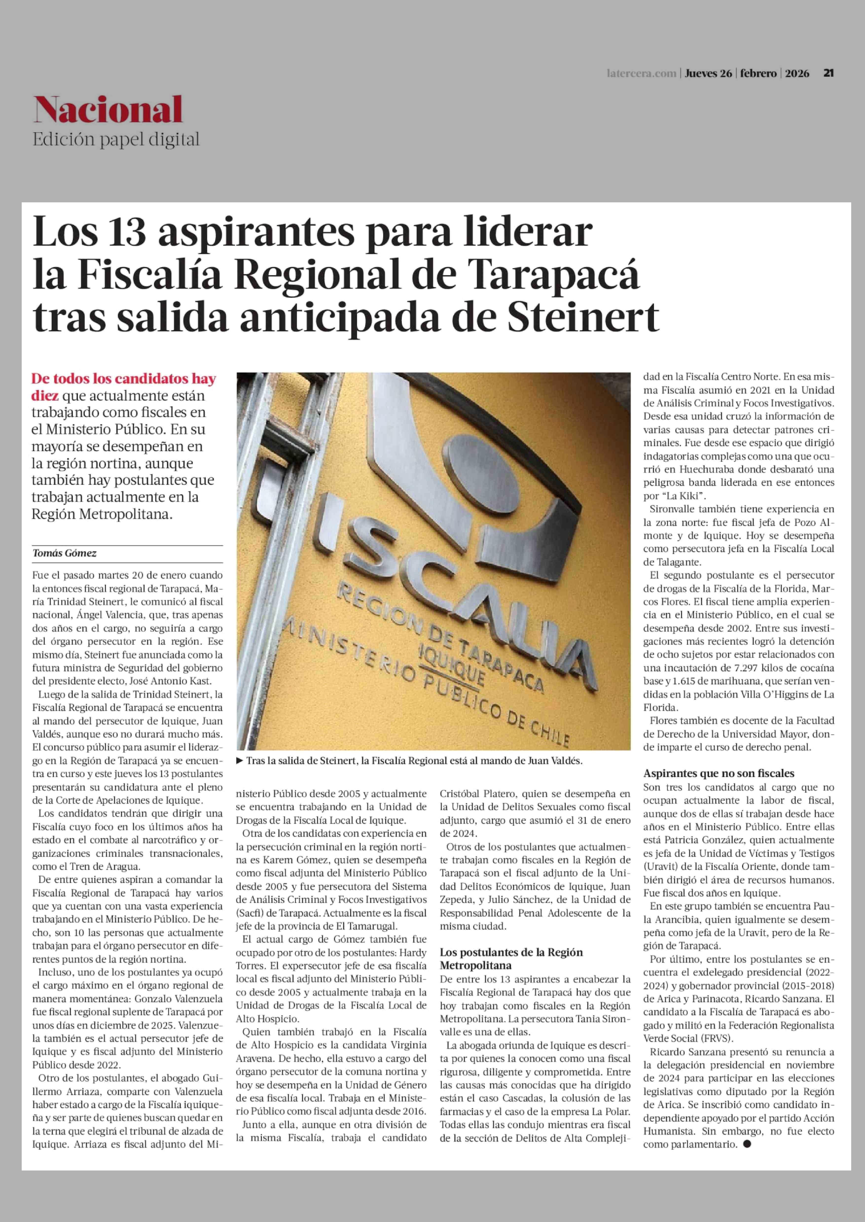 Los 13 aspirantes para liderar la Fiscalía Regional de Tarapacá tras salida anticipada de Steinert 26-02-2026 La Tercera |