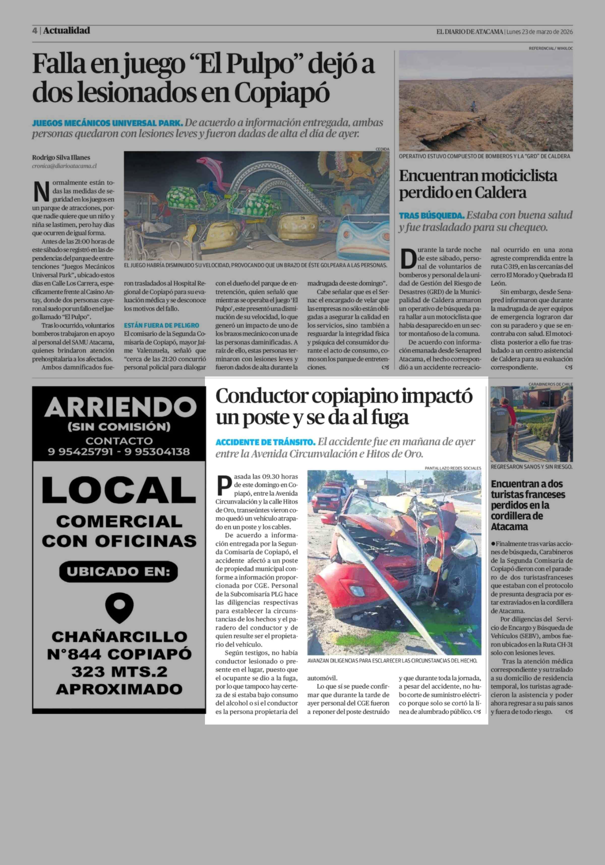 Conductor copiapino impactó un poste y se da al fuga 23-03-2026 El Diario de Atacama |