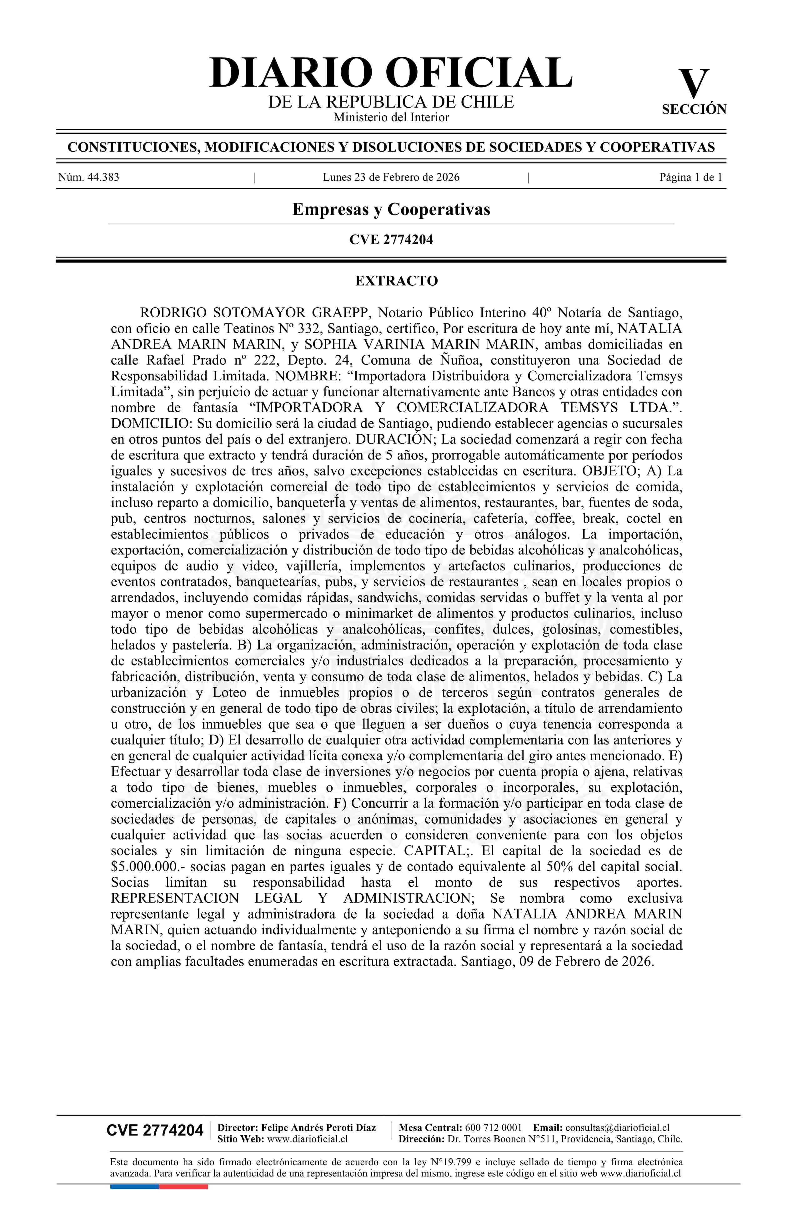 Importadora Distribuidora y Comercializadora Temsys Limitada 23-02-2026 Diario Oficial Edición Electrónica |