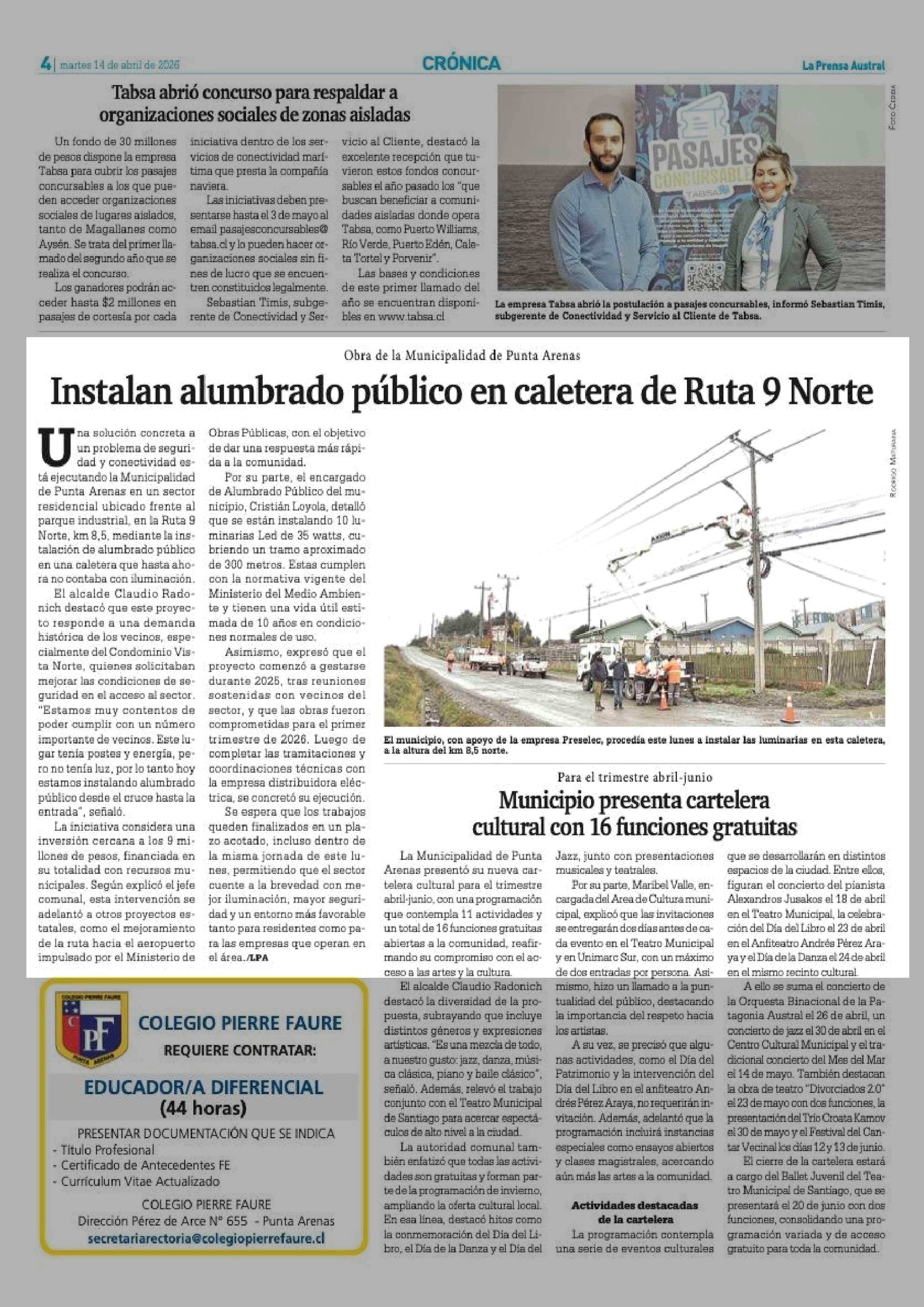 | Fecha: | 14-04-2026 | Sector: | Noticia general | Región: | Región de Magallanes y de la Antártica Chilena |