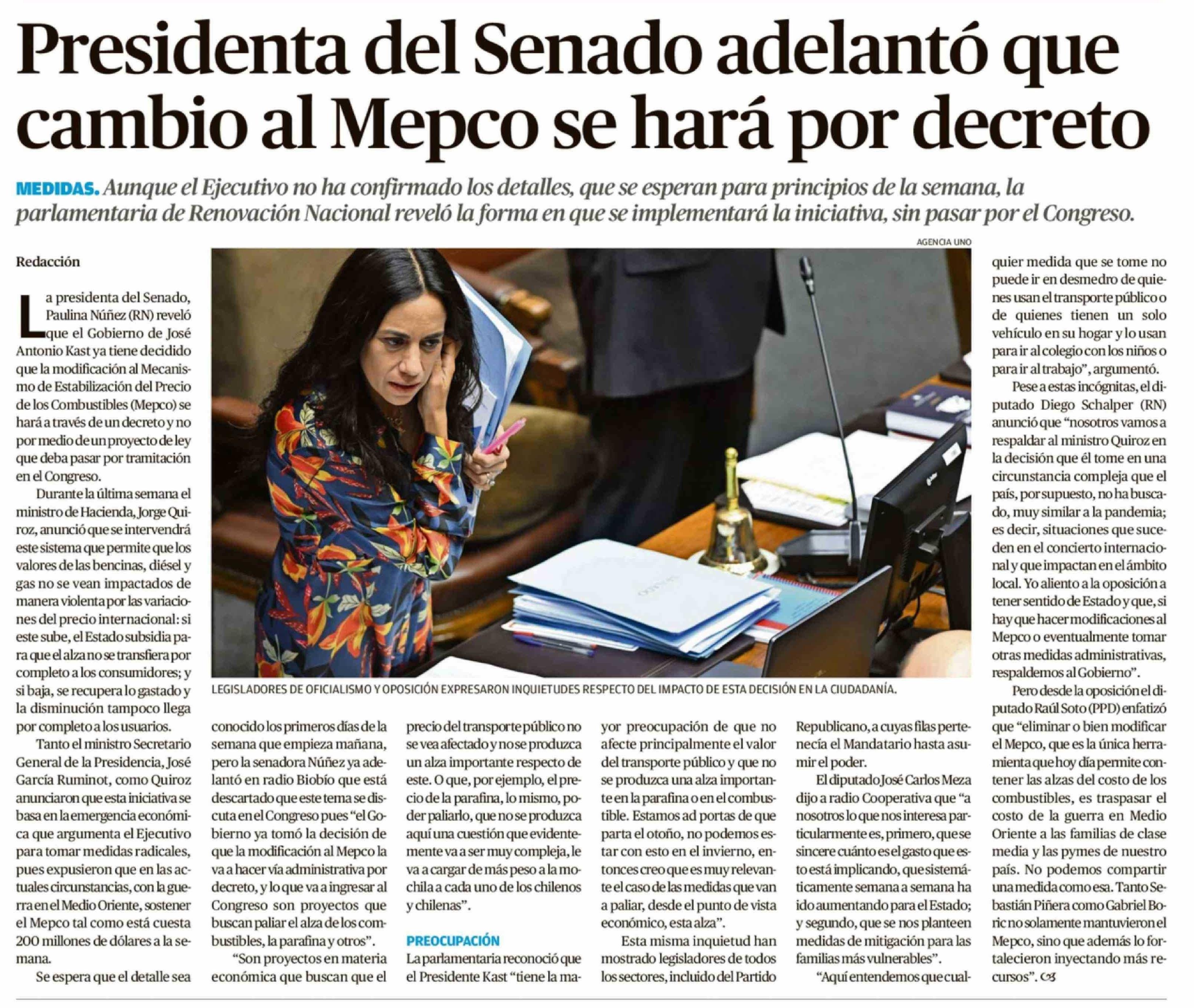 Título: Presidenta del Senado adelantó que cambio al Mepco se hará por decreto