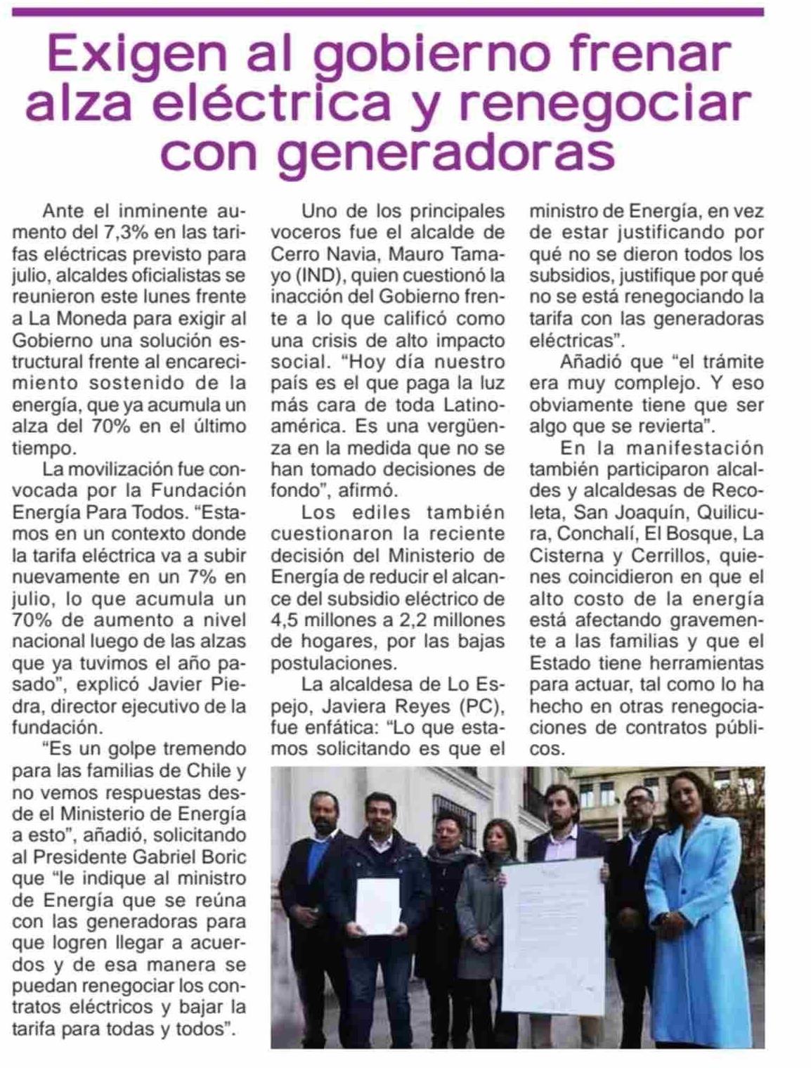 Exigen al gobierno frenar alza eléctrica y renegociar con generadoras 21-05-2025 Maule Hoy |