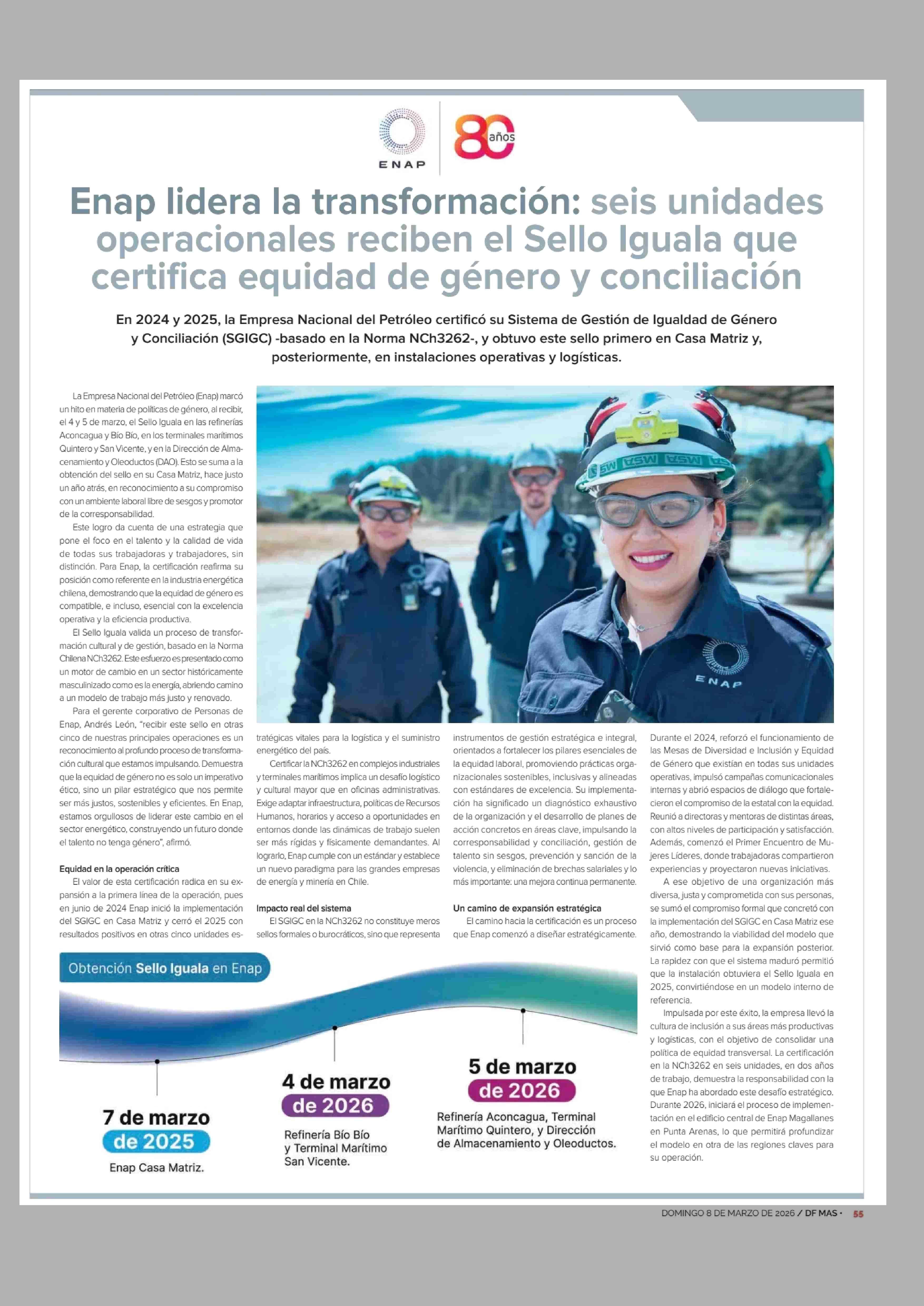 Enap lidera la transformación: seis unidades operacionales reciben el Sello Iguala que certifica equidad de género y conciliación 08-03-2026 Diario Financiero |