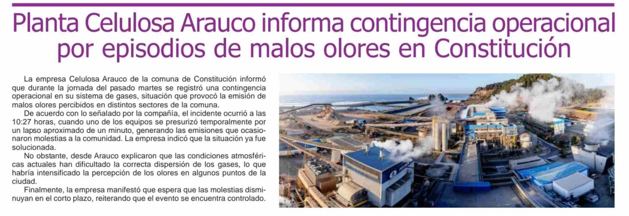 Planta Celulosa Arauco informa contingencia operacional por episodios de malos olores en Constitución 24-01-2026 Maule Hoy |