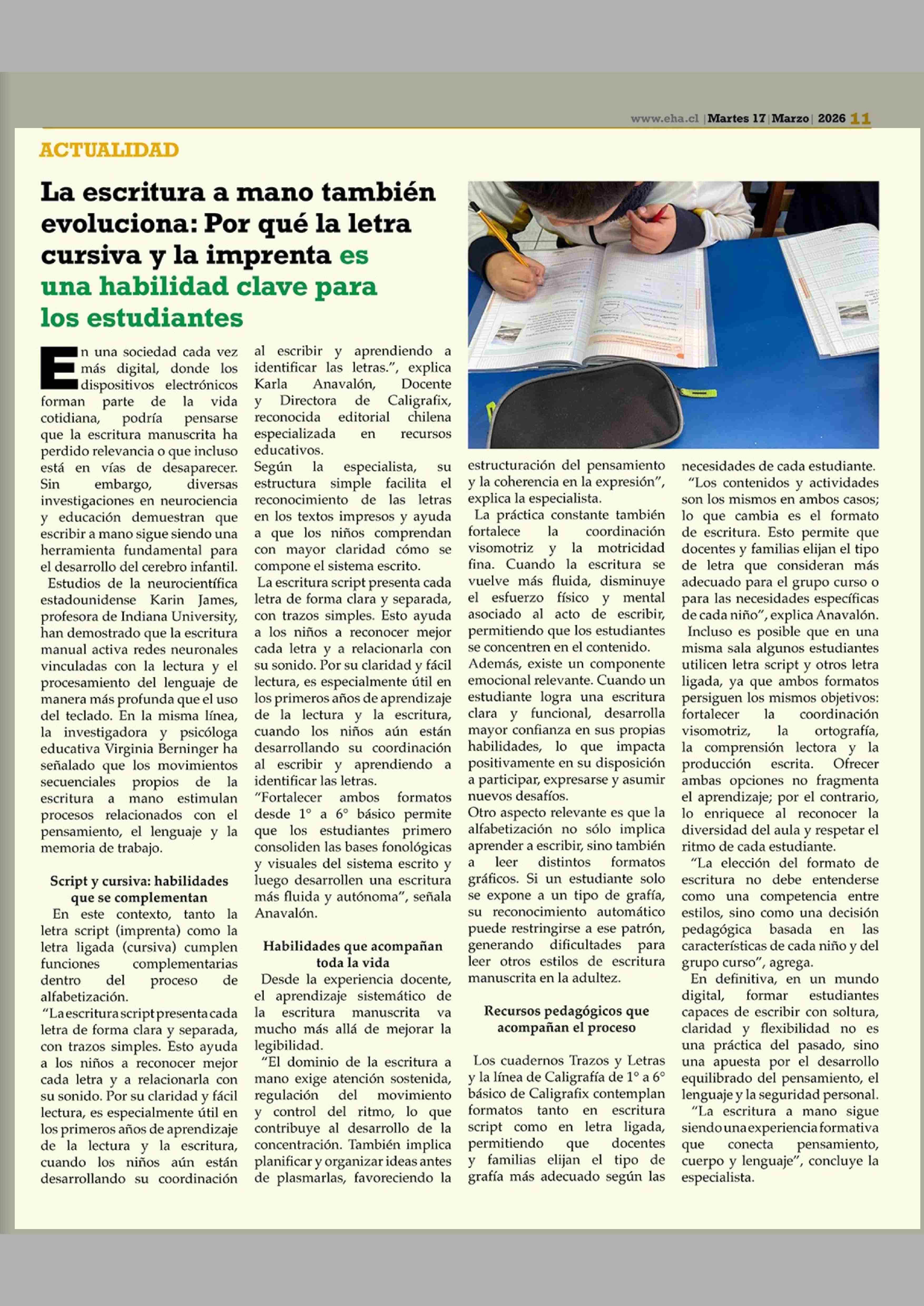 La escritura a mano también evoluciona: Por qué la letra cursiva y la imprenta es una habilidad clave para los estudiantes 17-03-2026 El Heraldo Austral |