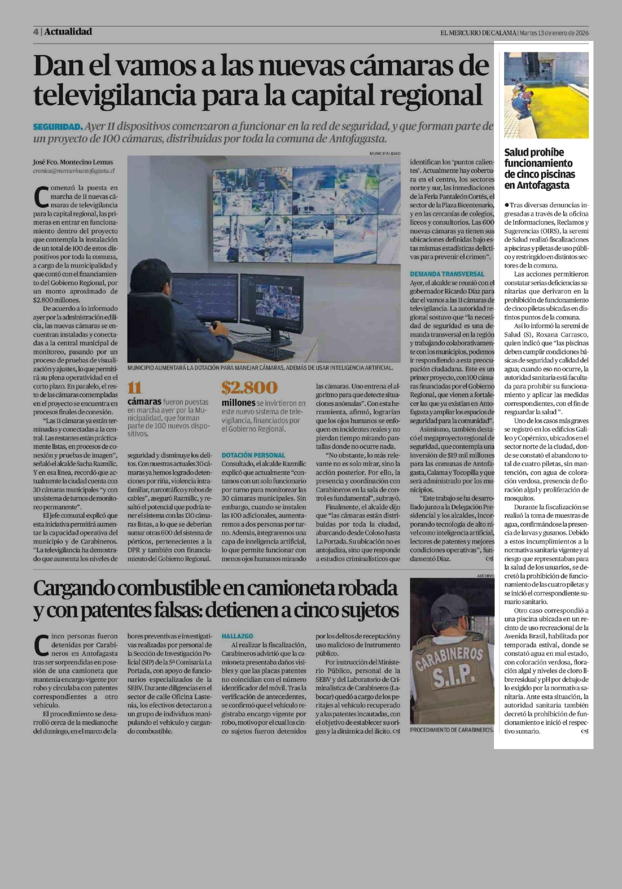 Salud prohíbe funcionamiento de cinco piscinas en Antofagasta 13-01-2026 El Mercurio de Calama |