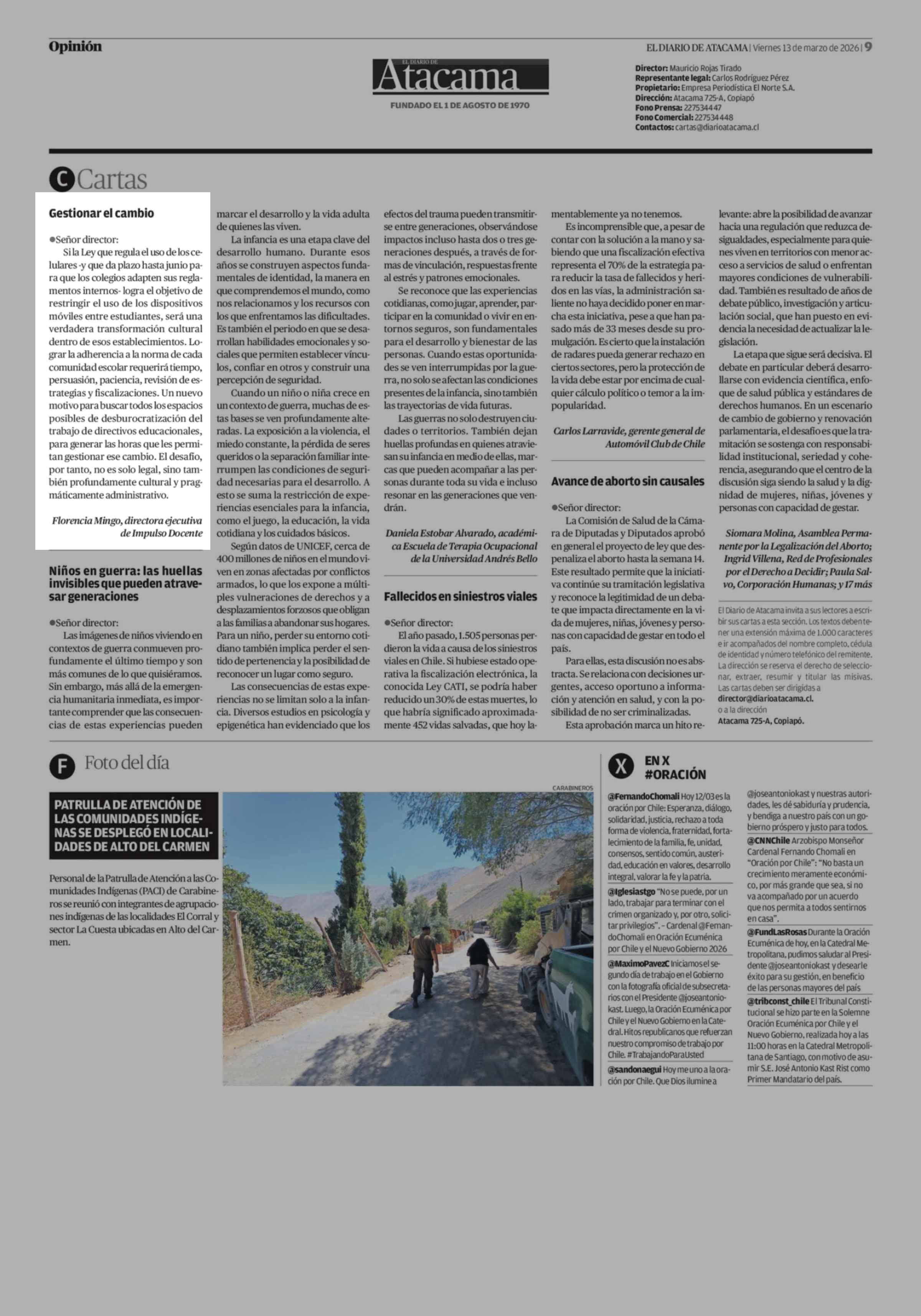 Cartas: Gestionar el cambio 13-03-2026 El Diario de Atacama |