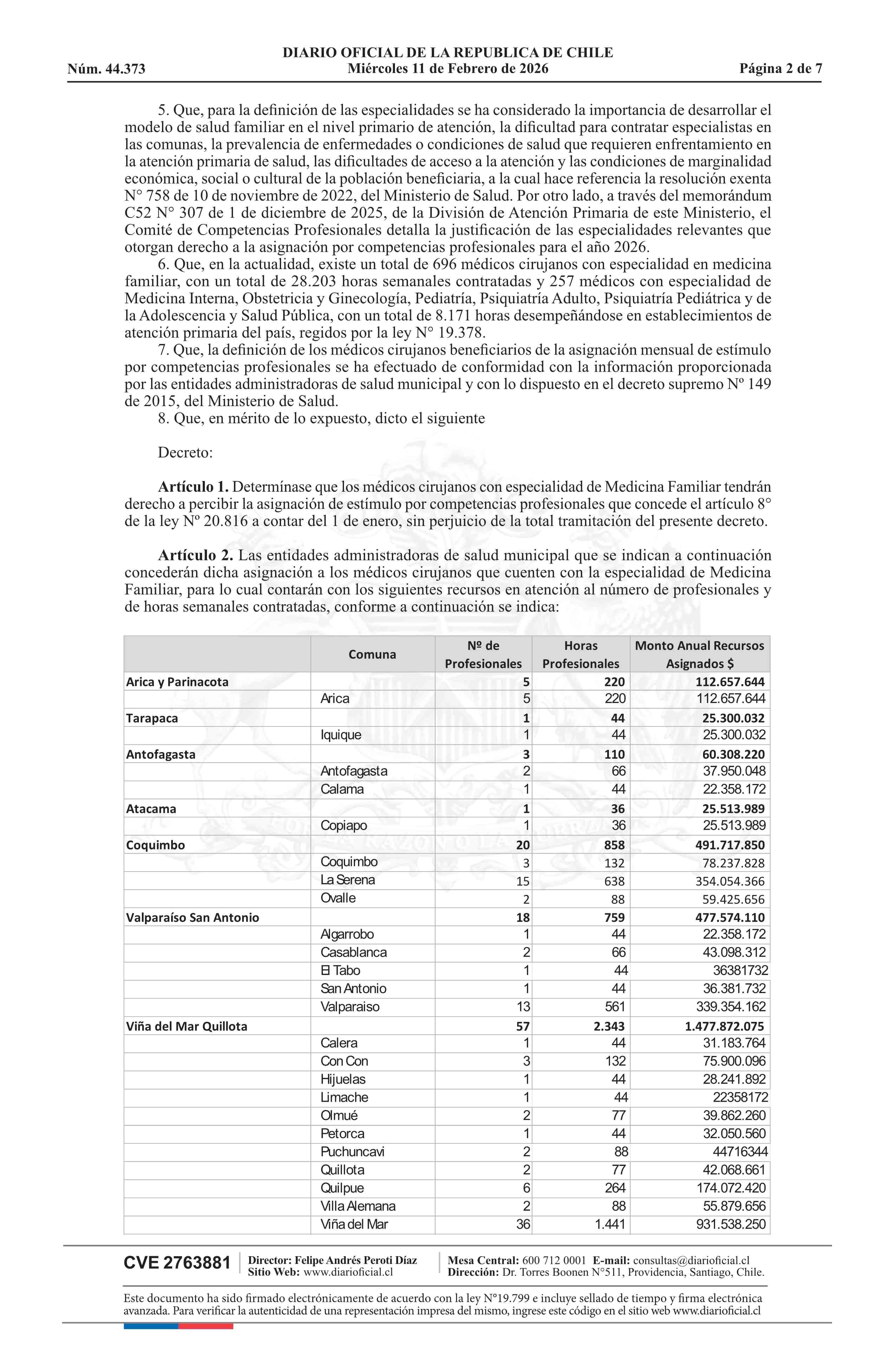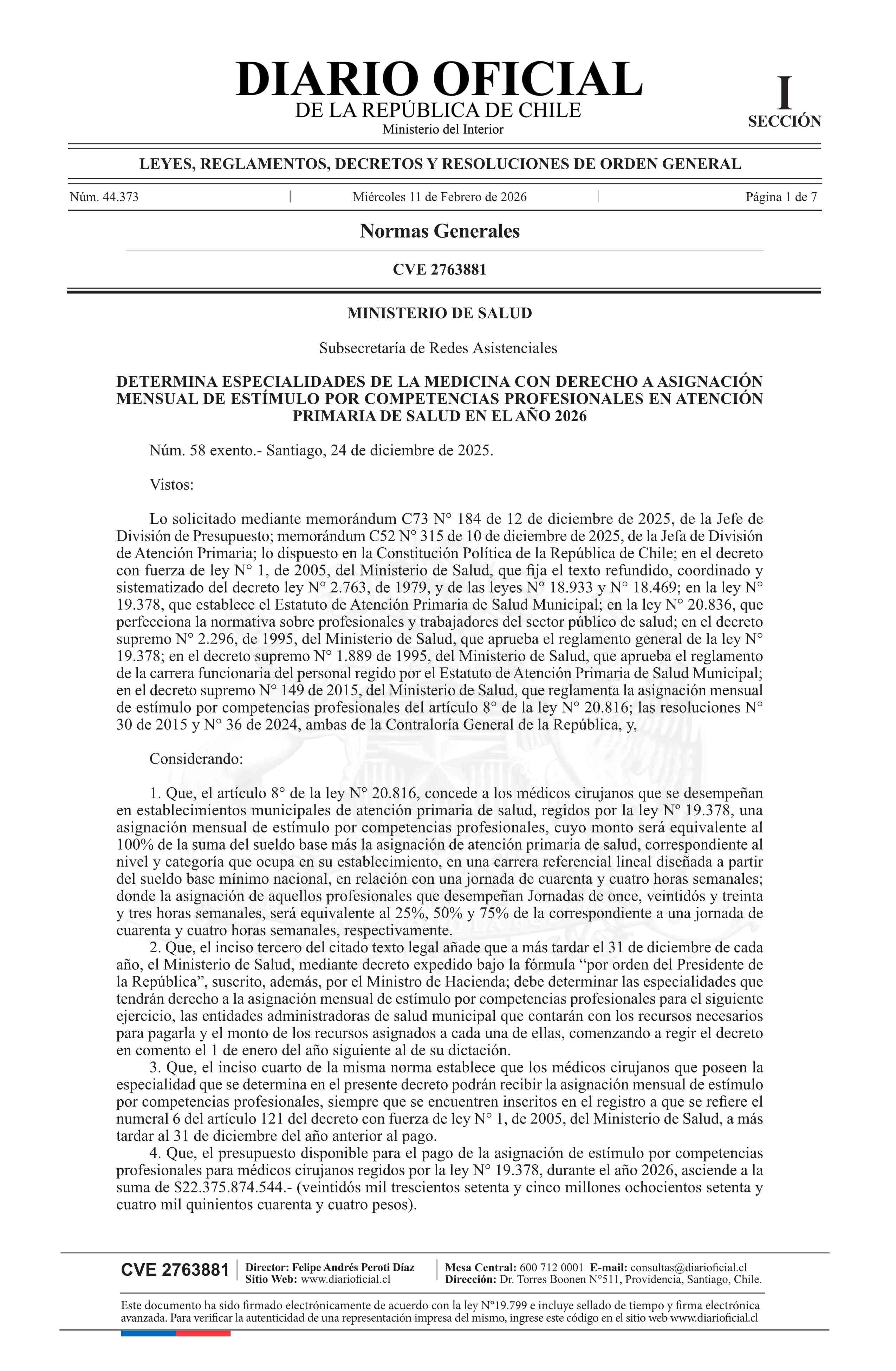 Título: Decreto exento número 58, de 2025.- Determina especialidades de la medicina con derecho a asignación mensual de estímulo por competencias profesionales en atención primaria de salud en el año 2026