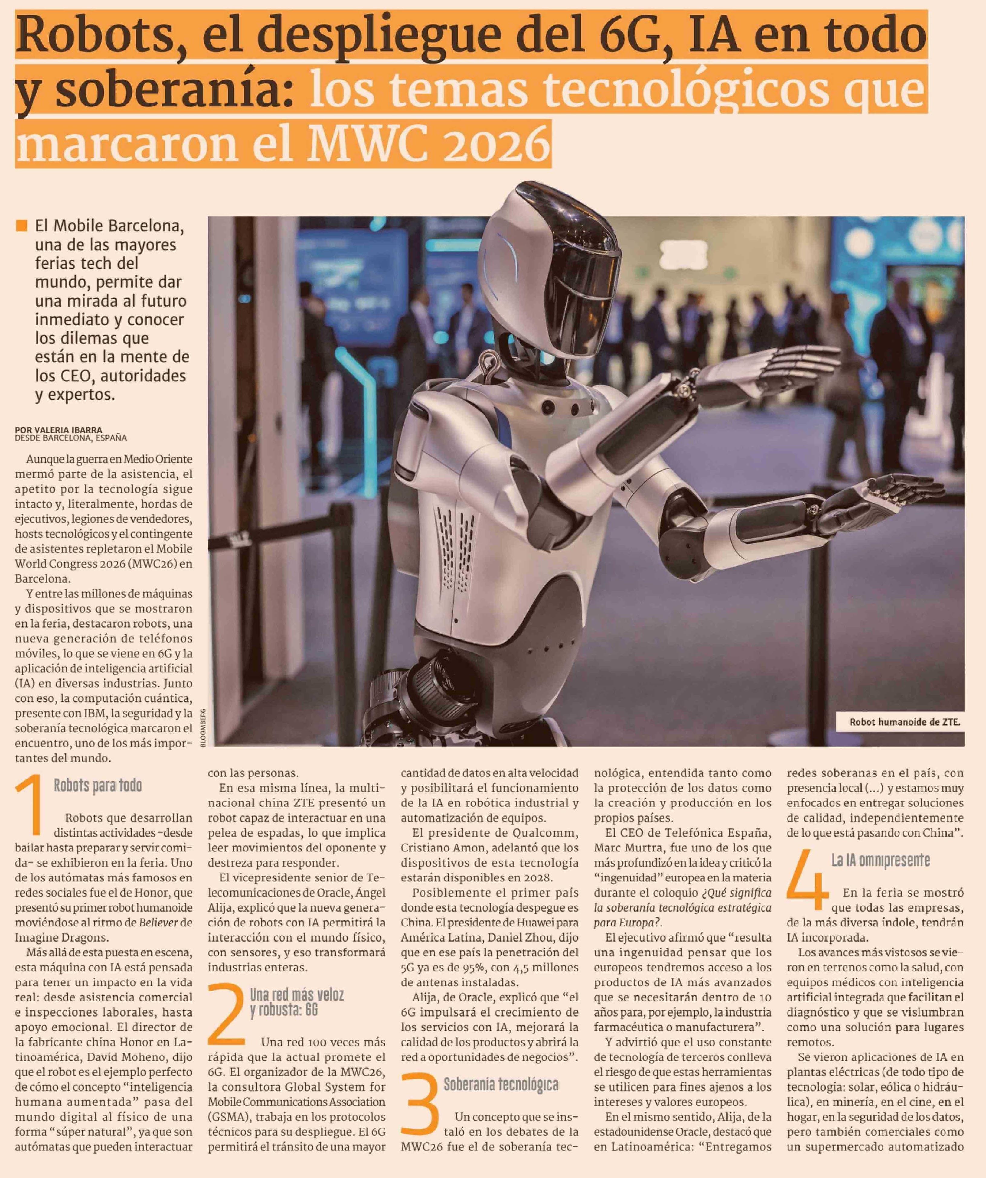 Robots, el despliegue del 6G, IA en todo y soberanía: los temas tecnológicos que marcaron el MWC 2026 06-03-2026 Diario Financiero |