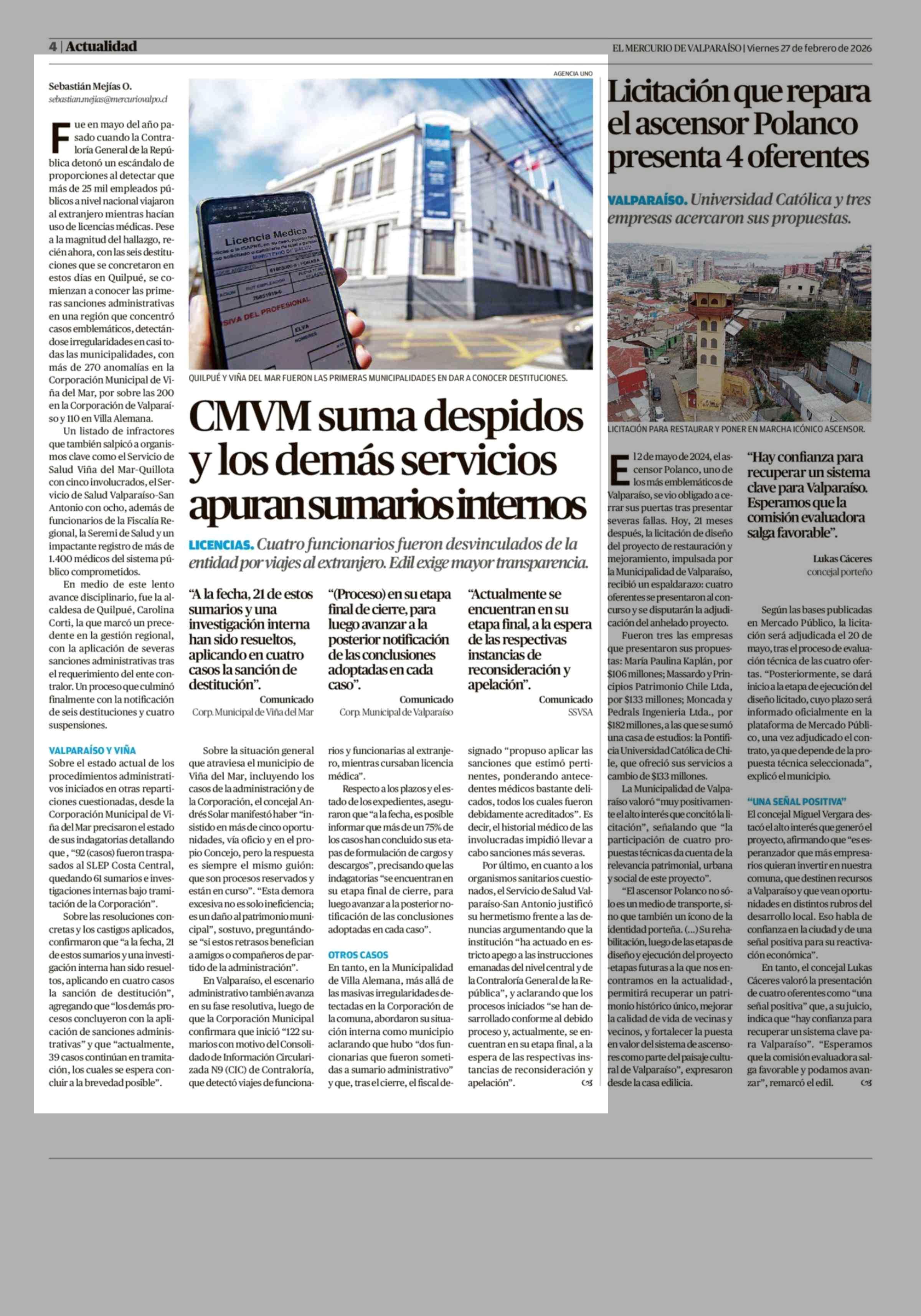 CMVM suma despidos y los demás servicios apuransumarios internos 27-02-2026 El Mercurio de Valparaíso |