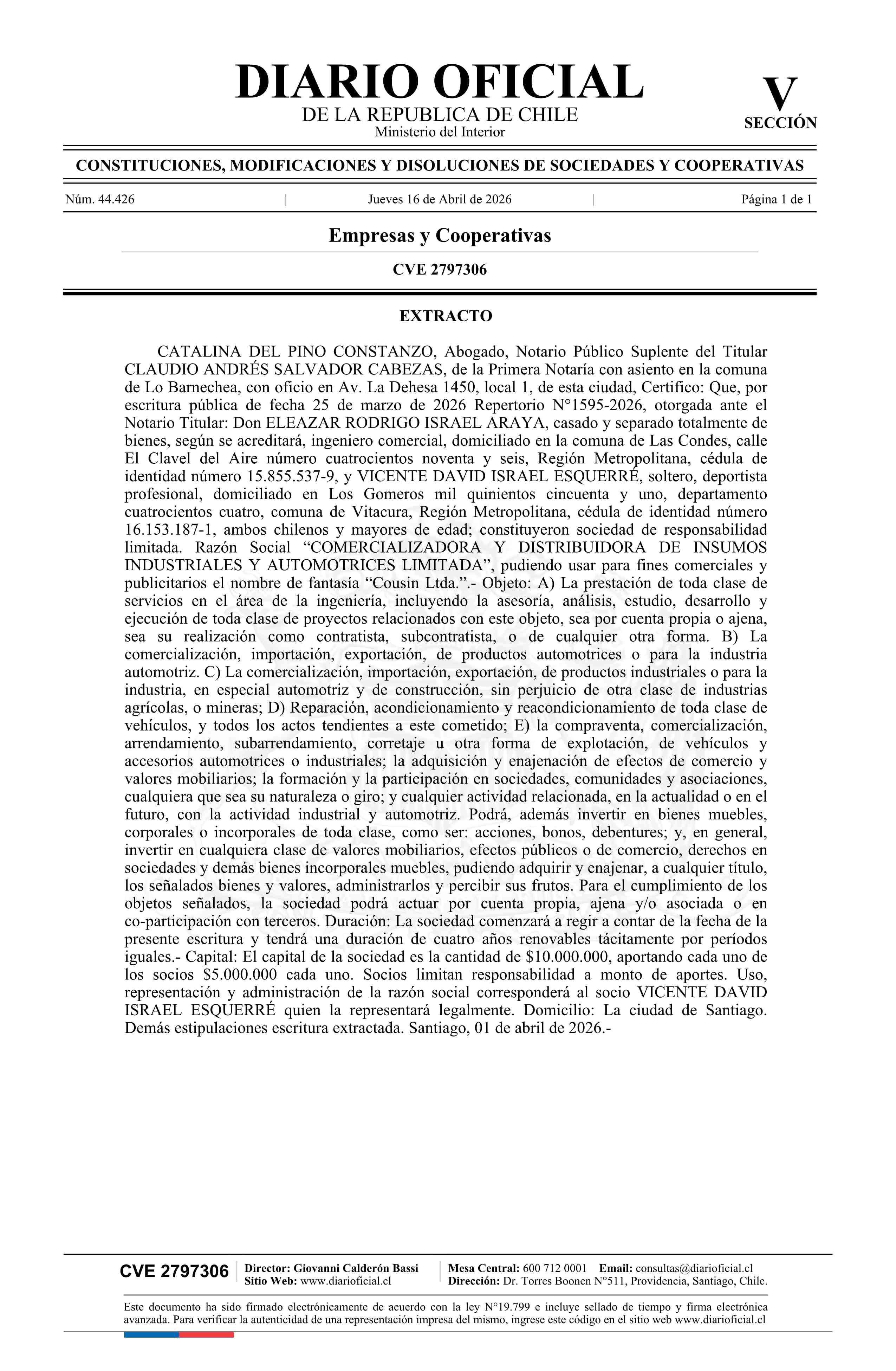 COMERCIALIZADORA Y DISTRIBUIDORA DE INSUMOS INDUSTRIALES Y AUTOMOTRICES LIMITADA 16-04-2026 Diario Oficial Edición Electrónica |