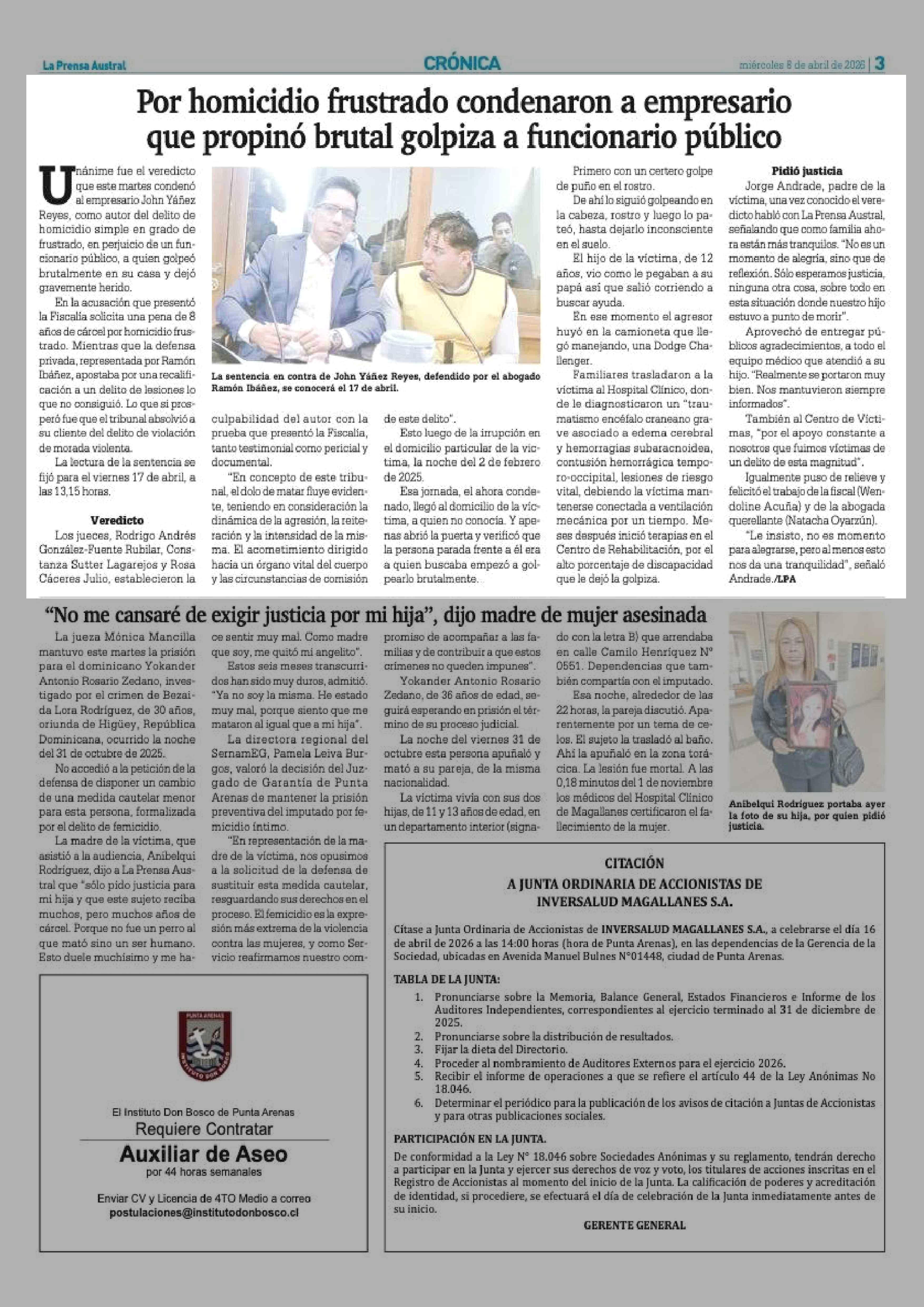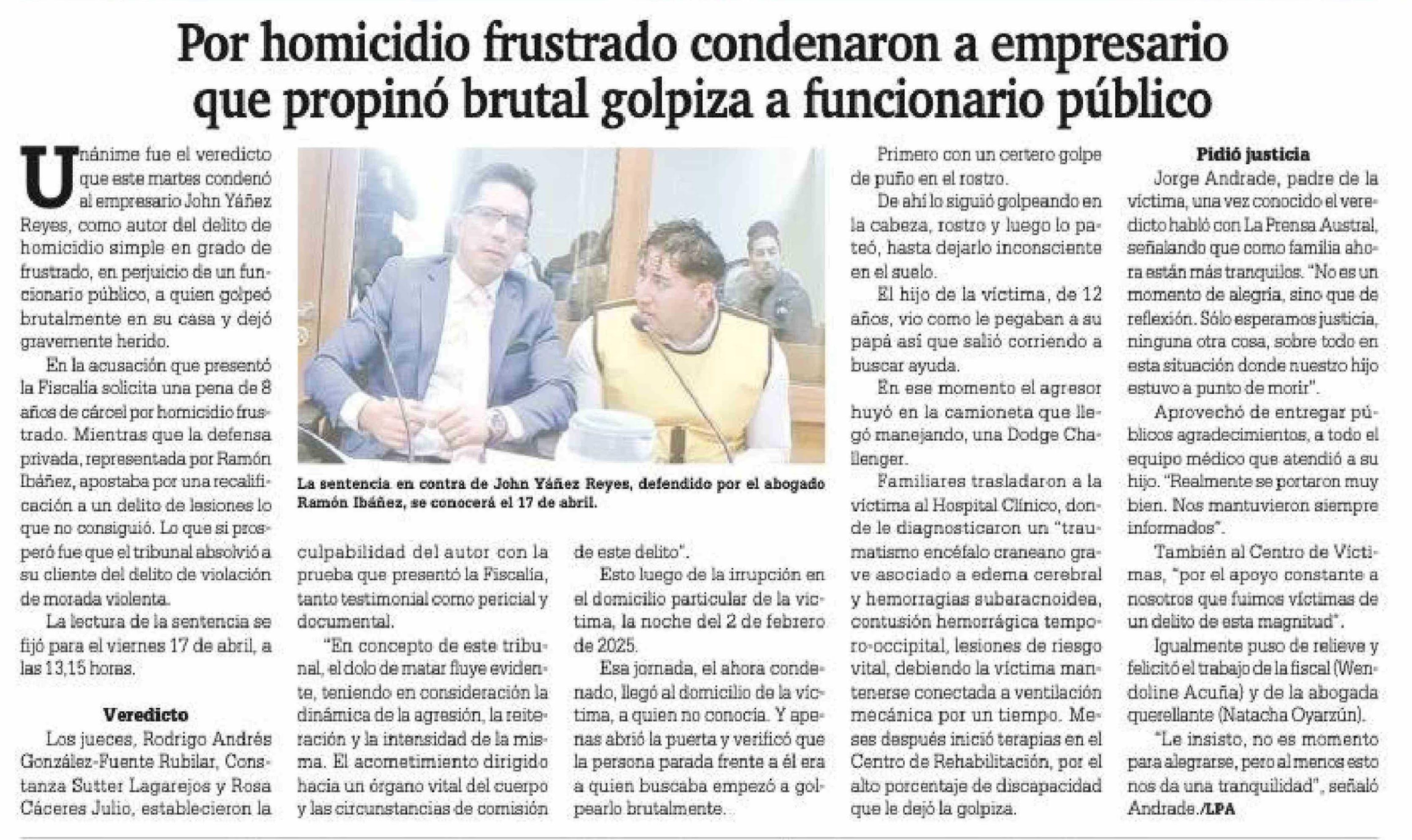 Por homicidio frustrado condenaron a empresario que propinó brutal golpiza a funcionario público 08-04-2026 La Prensa Austral |