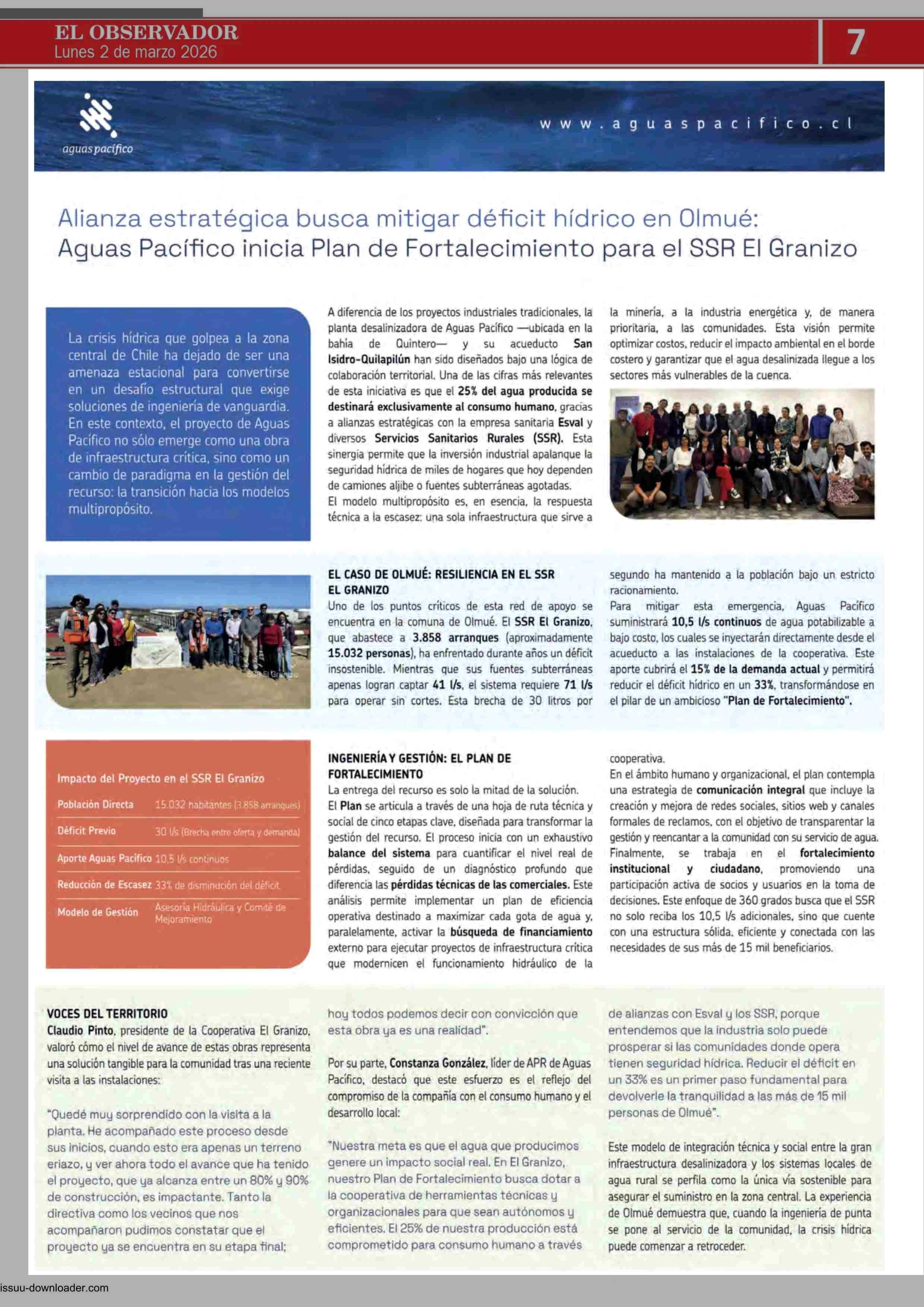 Alianza estratégica busca mitigar déficit hídrico en Olmué: Aguas Pacífico inicia Plan de Fortalecimiento para el SSR El Granizo 02-03-2026 El Observador Vespertino |