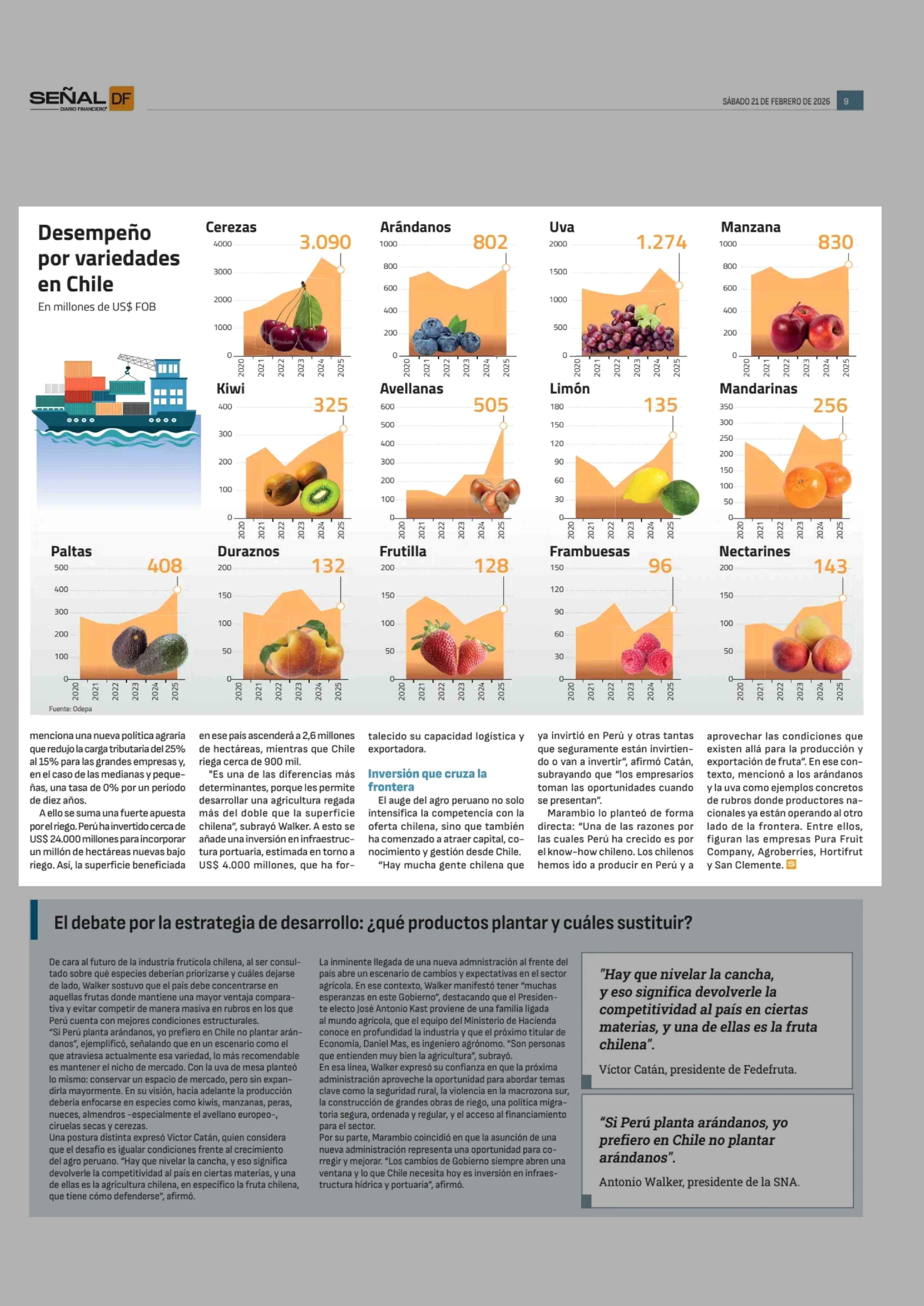 Competencia agrícola peruana se intensifica: exportaciones de fruta alcanzaron a las chilenas en 2025 21-02-2026 Diario Financiero |