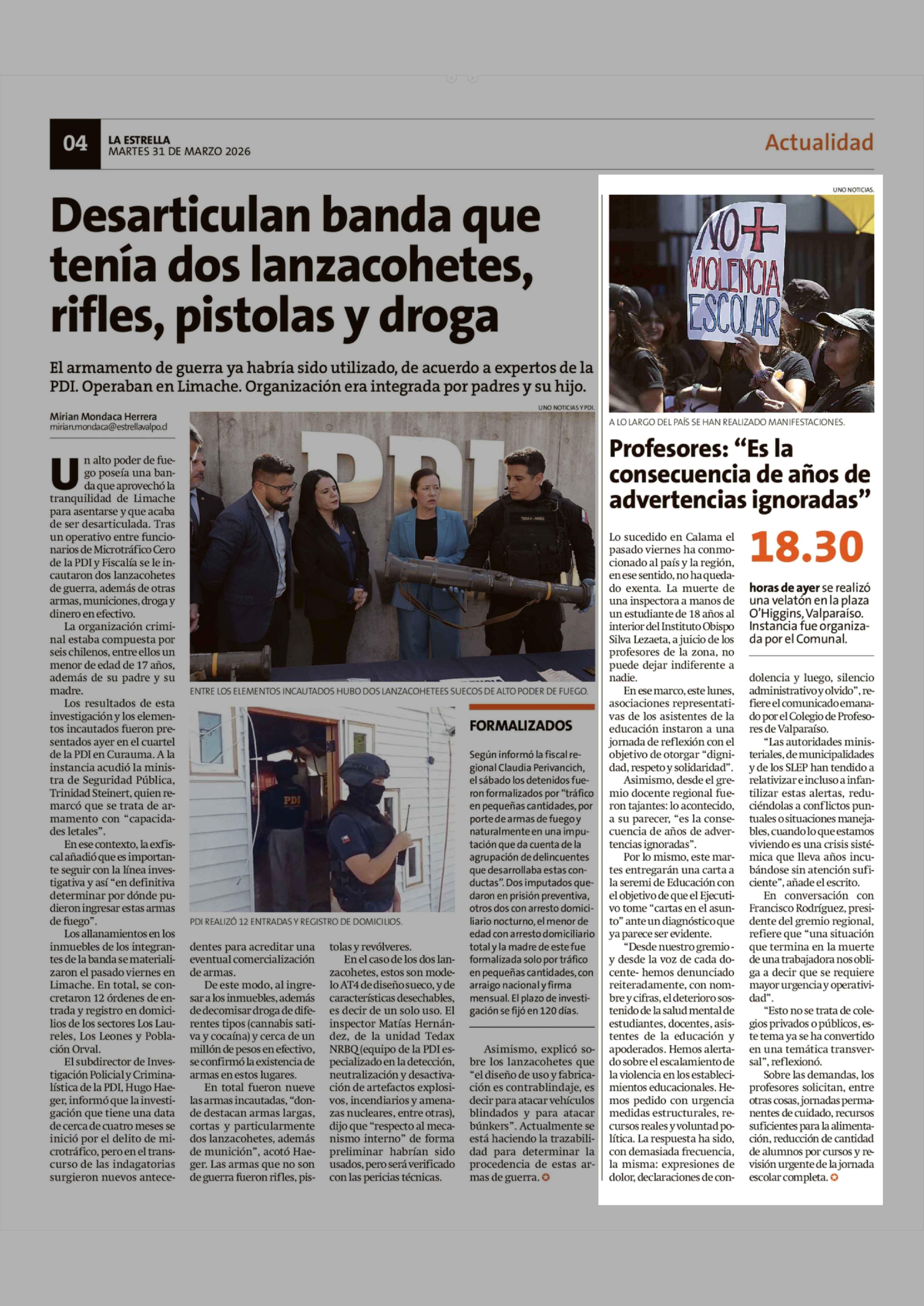 Profesores: "Es la consecuencia de años de advertencias ignoradas" 31-03-2026 La Estrella de Valparaíso |