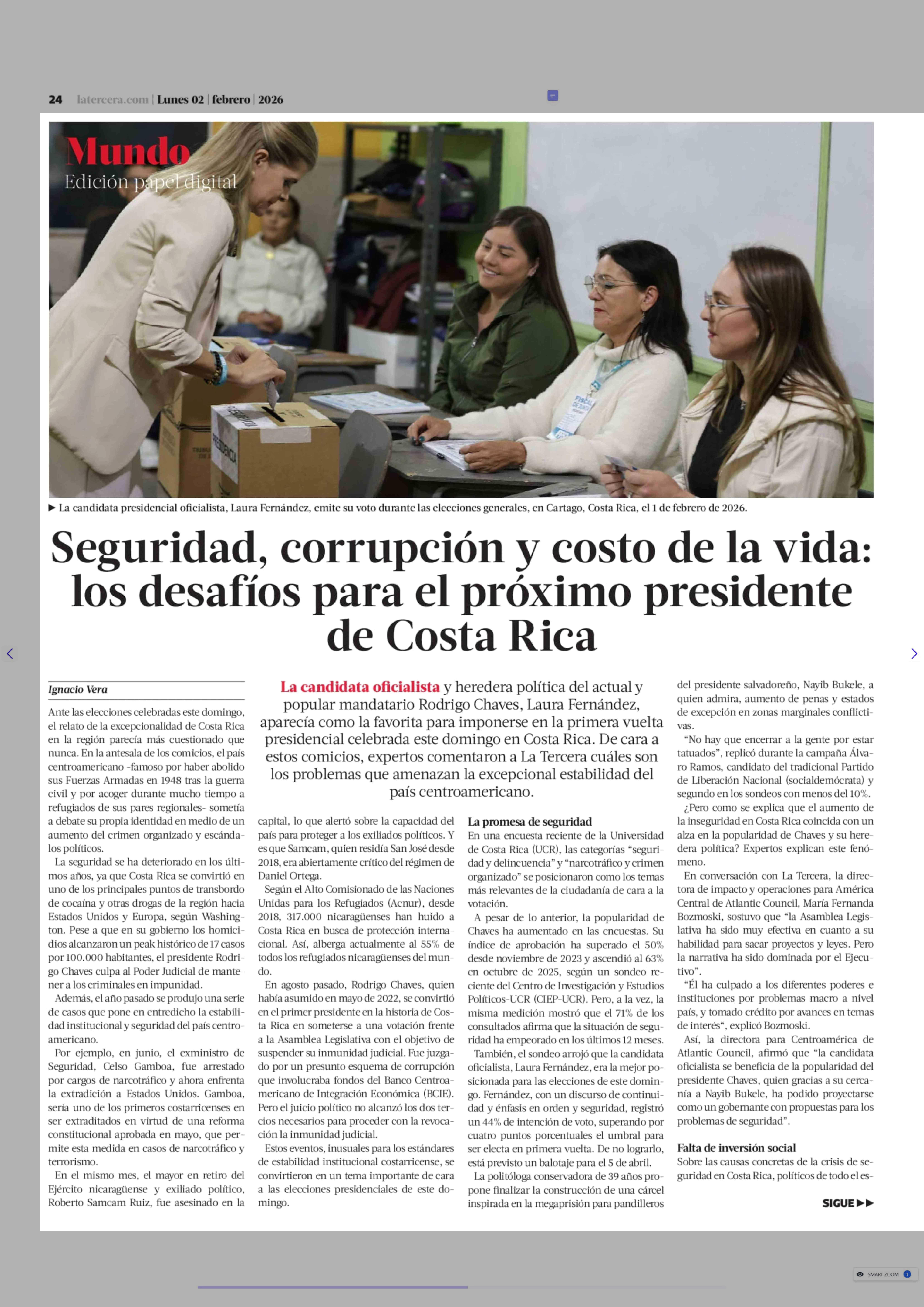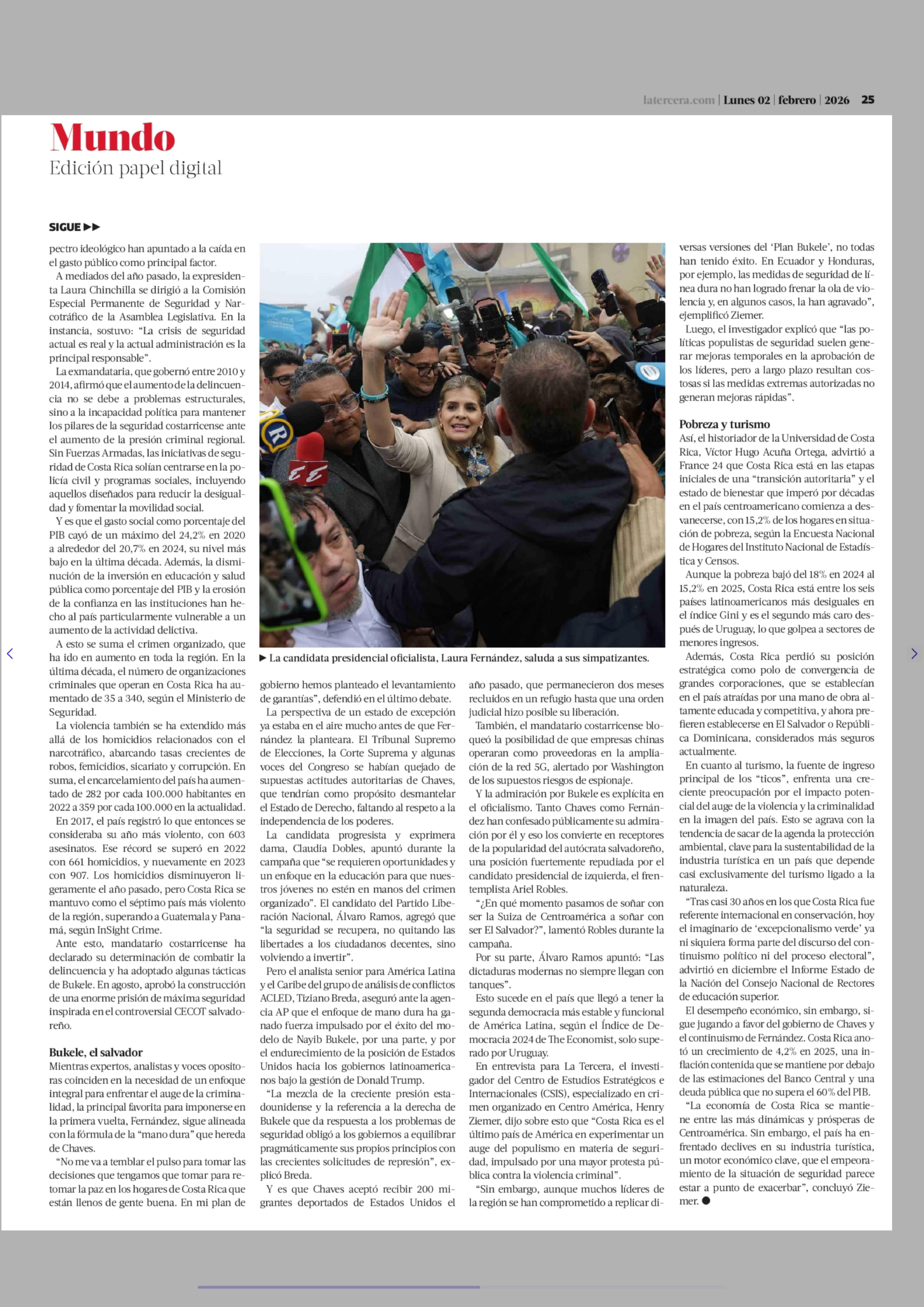 Seguridad, corrupción y costo de la vida: los desafíos para el próximo presidente de Costa Rica 02-02-2026 La Tercera |
