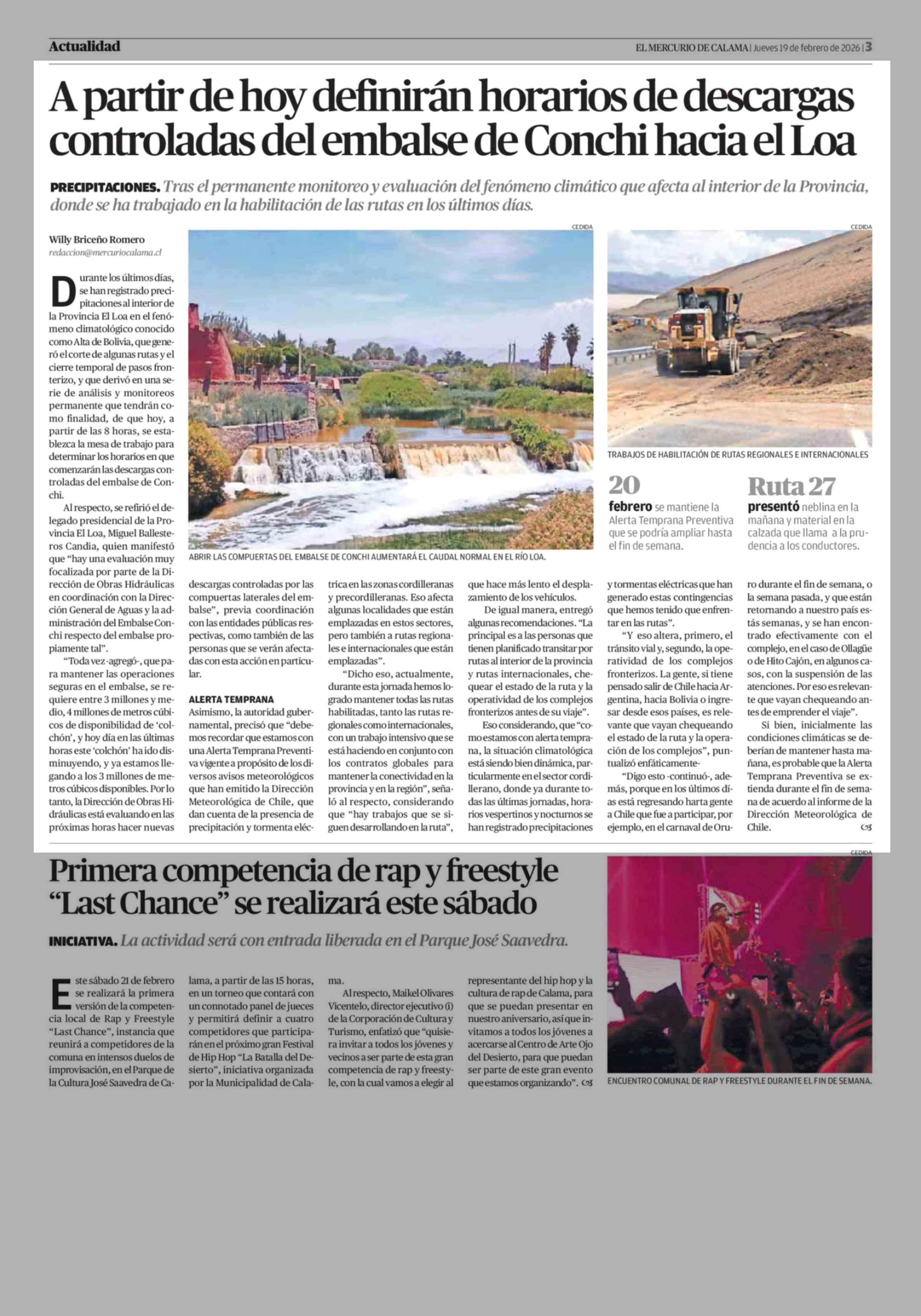 A partir de hoy definirán horarios de descargas controladas del embalse de Conchi hacia el Loa 19-02-2026 El Mercurio de Calama |