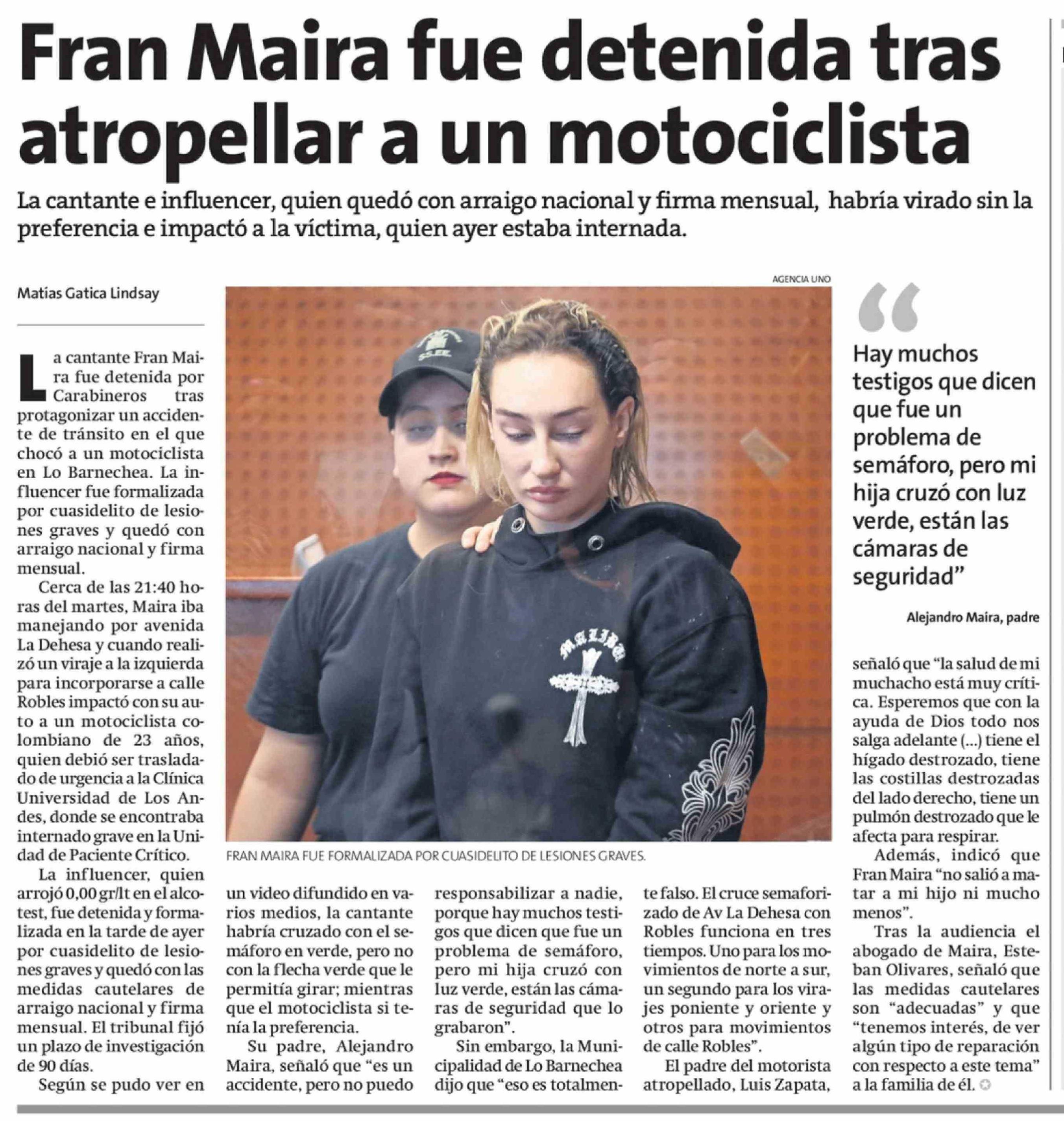 Fran Maira fue detenida tras atropellar a un motociclista 26-02-2026 La Estrella de Concepción |
