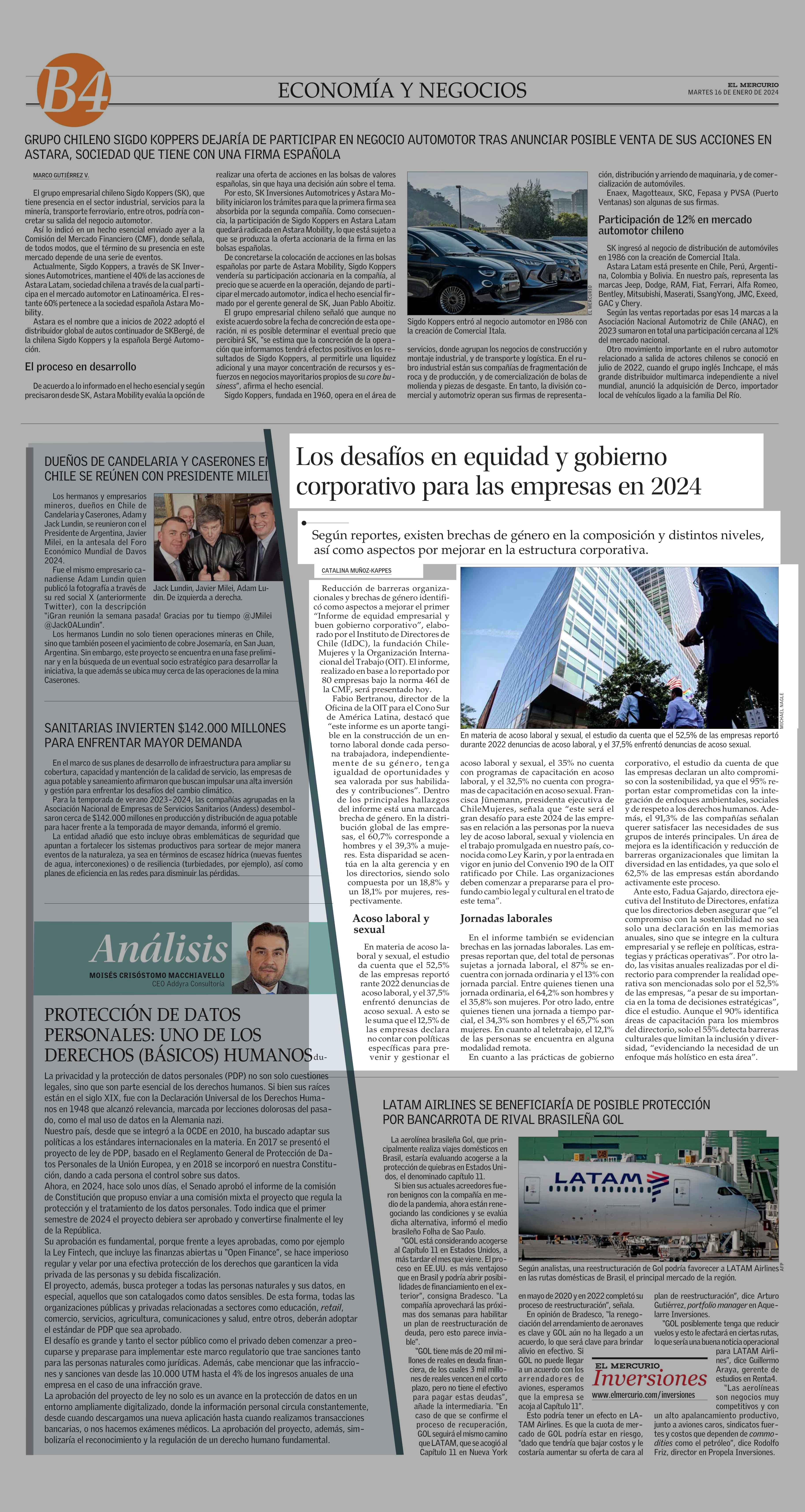 Los desafíos en equidad y gobierno corporativo para las empresas en 2024 16-01-2024 El Mercurio |